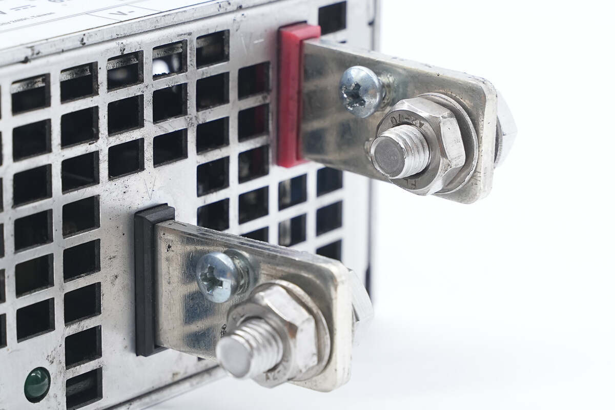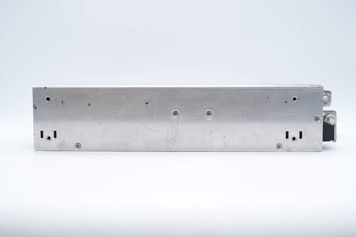 明纬这款开关电源采用铝合金外壳,通过螺丝固定,底部设有接线端子,在接线端子处粘贴信息标签。
