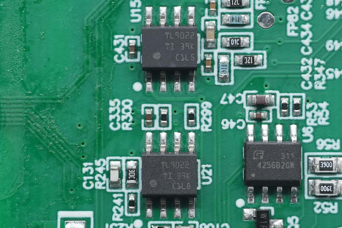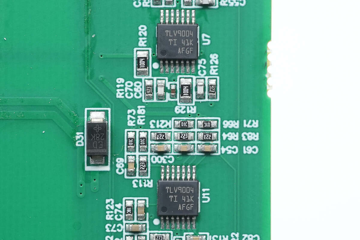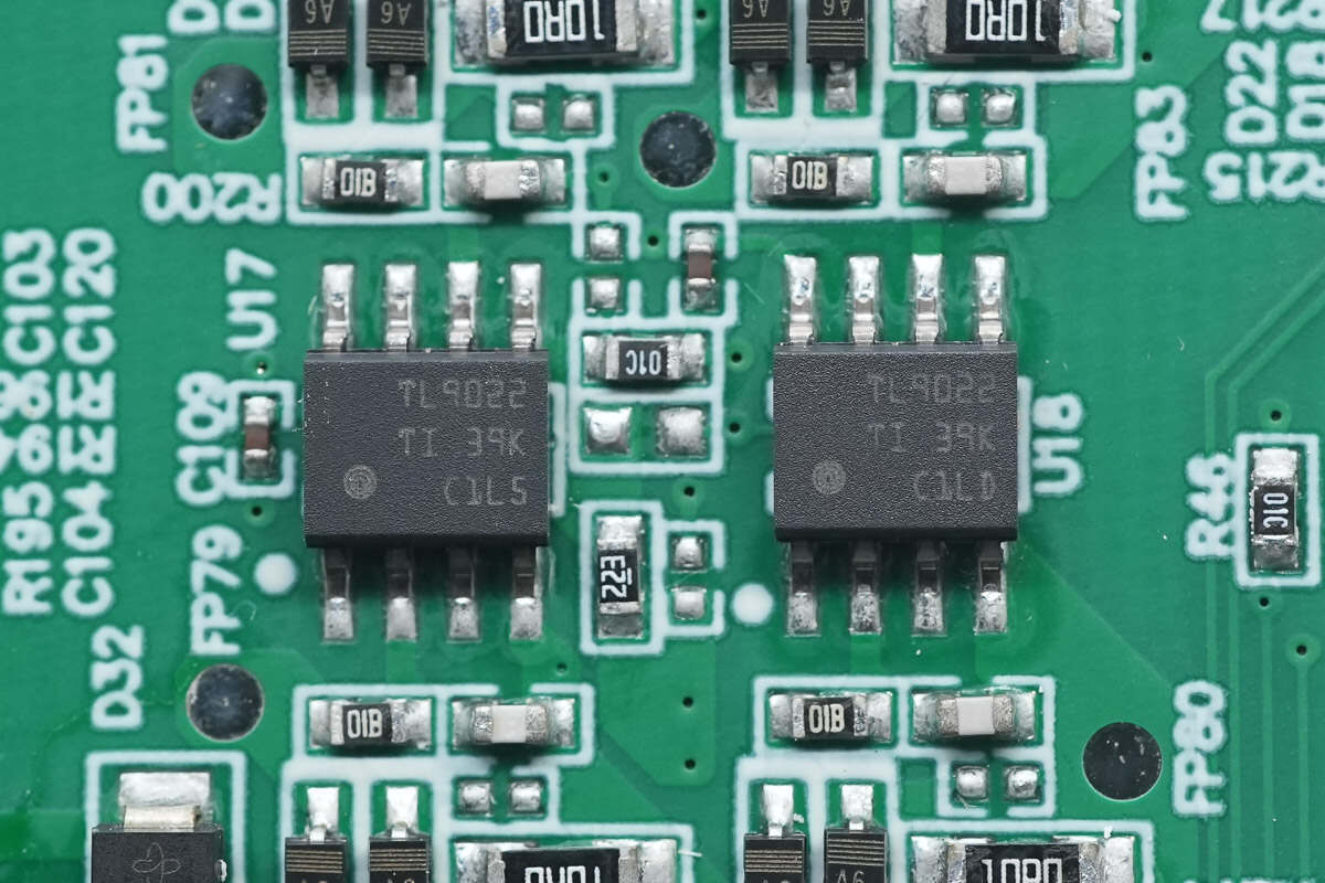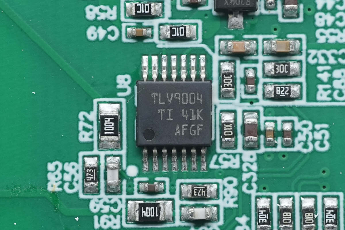 运放芯片来自德州仪器,型号TLV9004,是一颗四通道低电压运放,具备轨至轨输入和输出摆幅能力,采用TSSOP14封装。