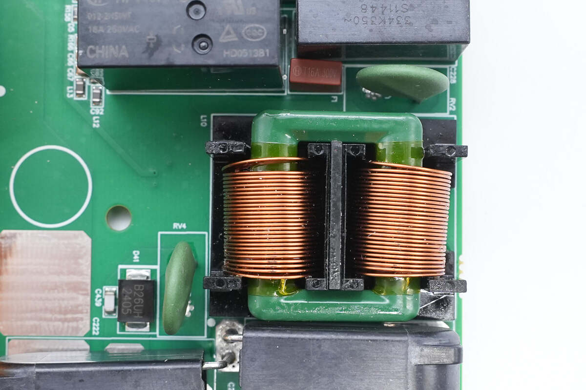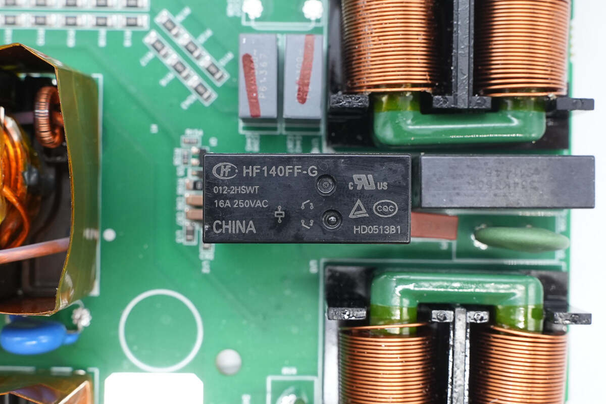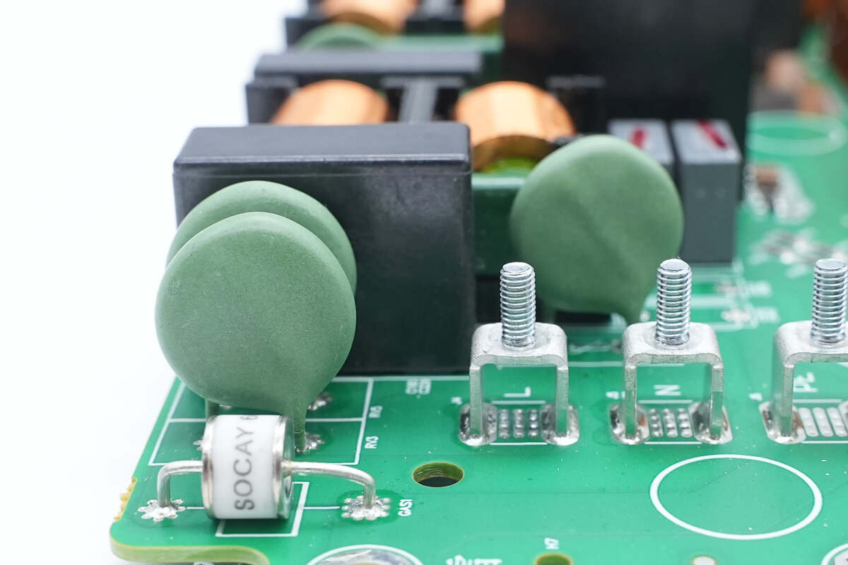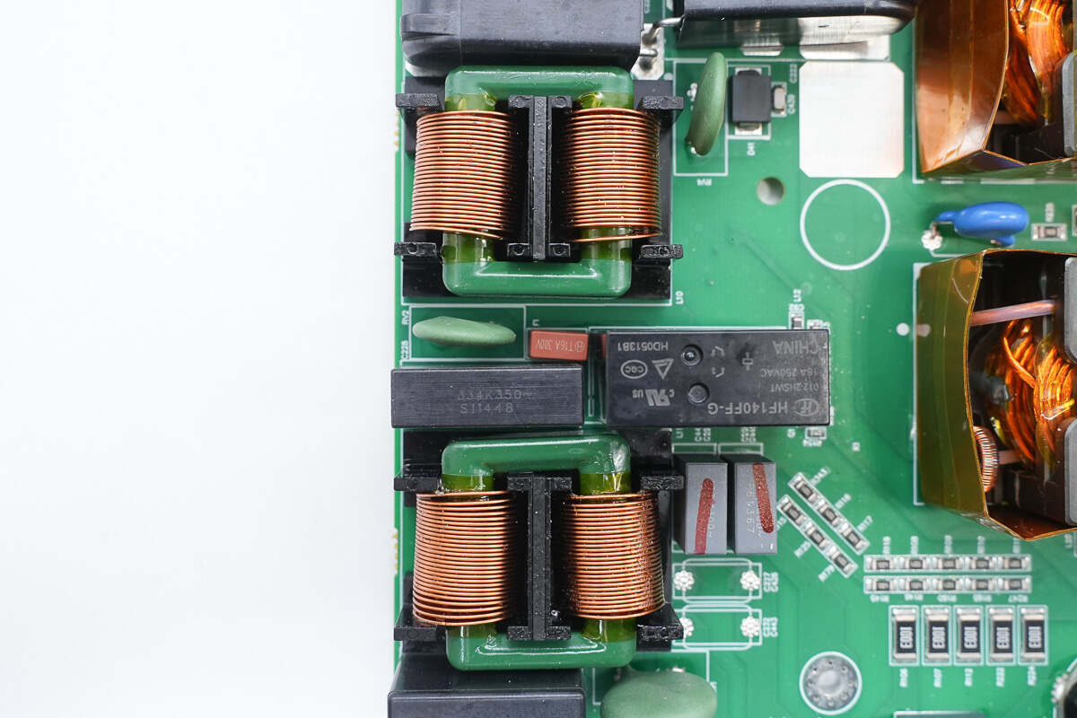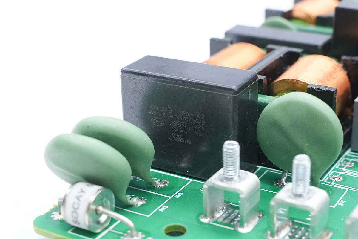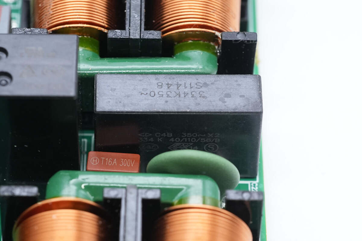 输出端设有共模电感,安规X2电容,压敏电阻,保险丝和继电器以及Y电容。