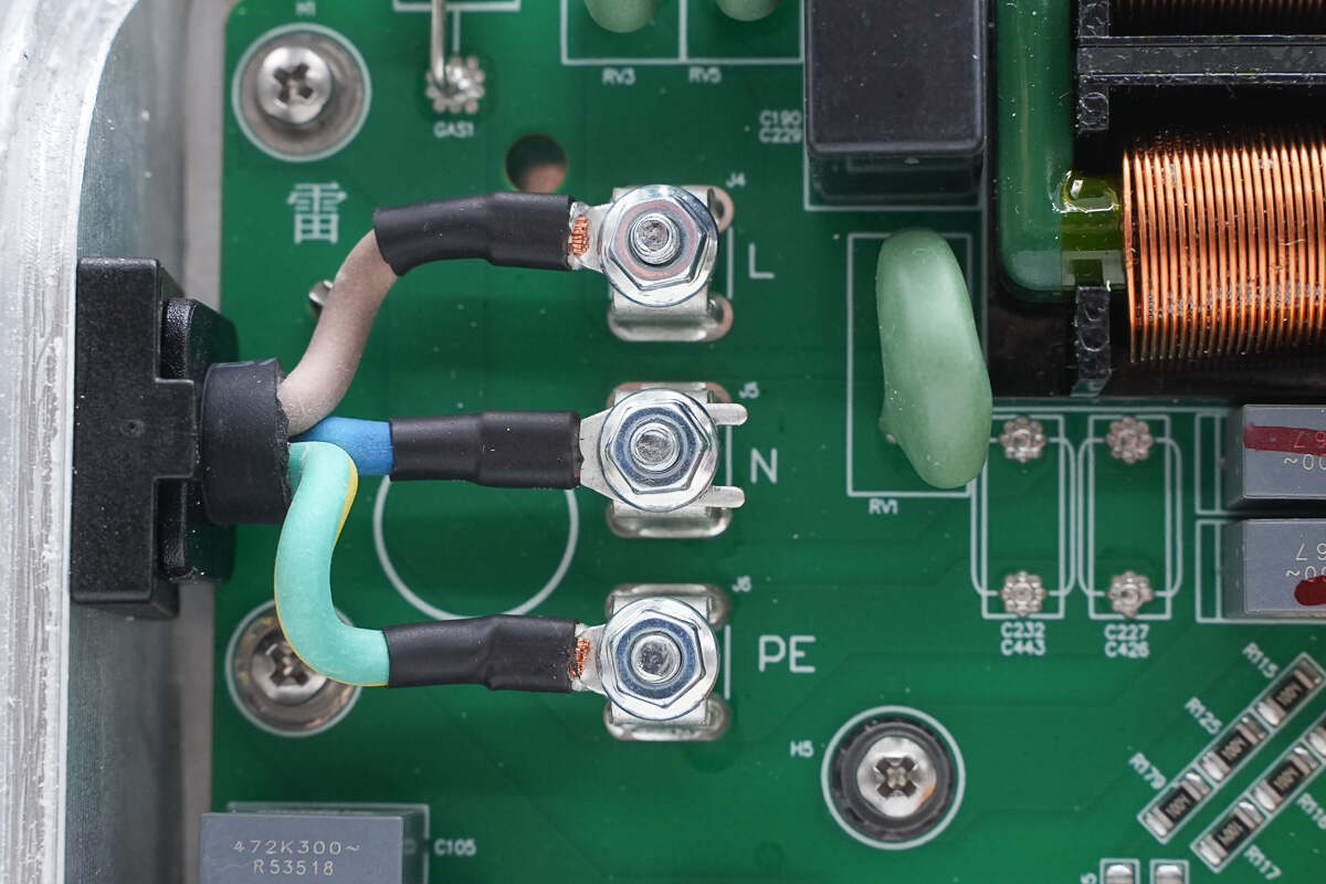 交流输出线通过压接端子和螺丝接线柱连接。