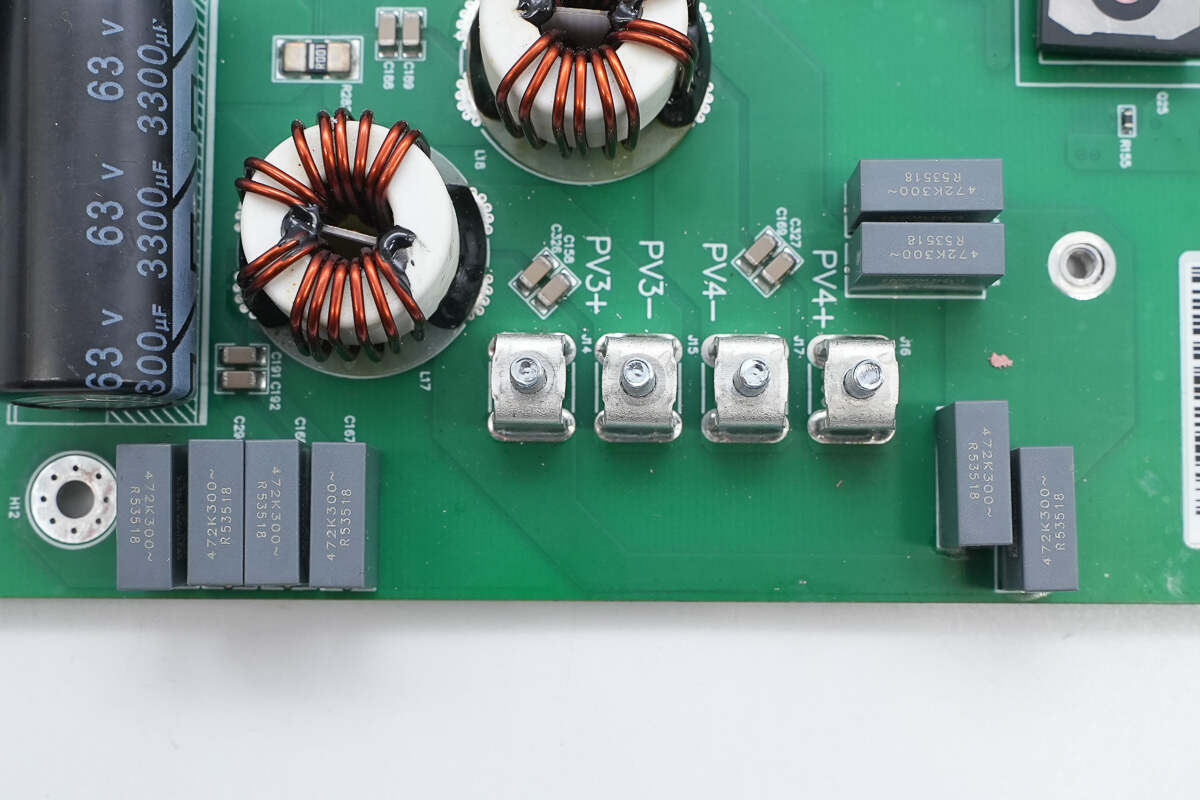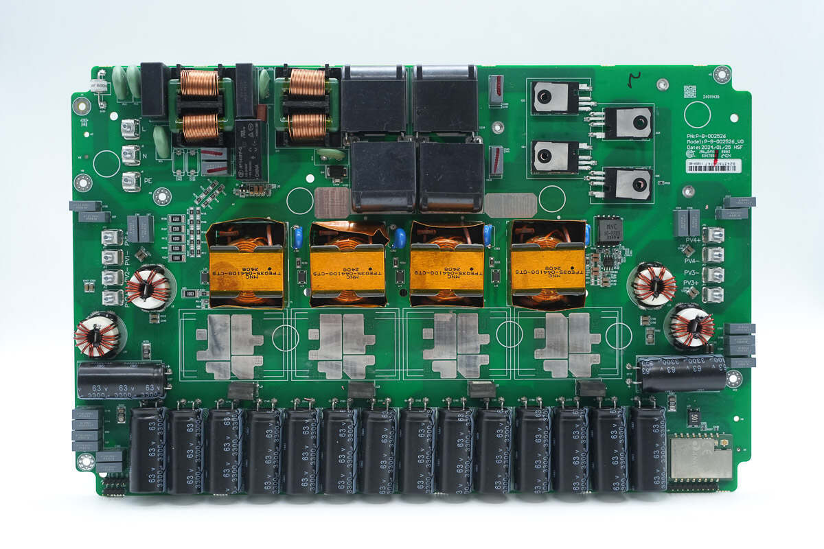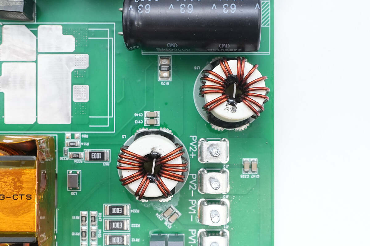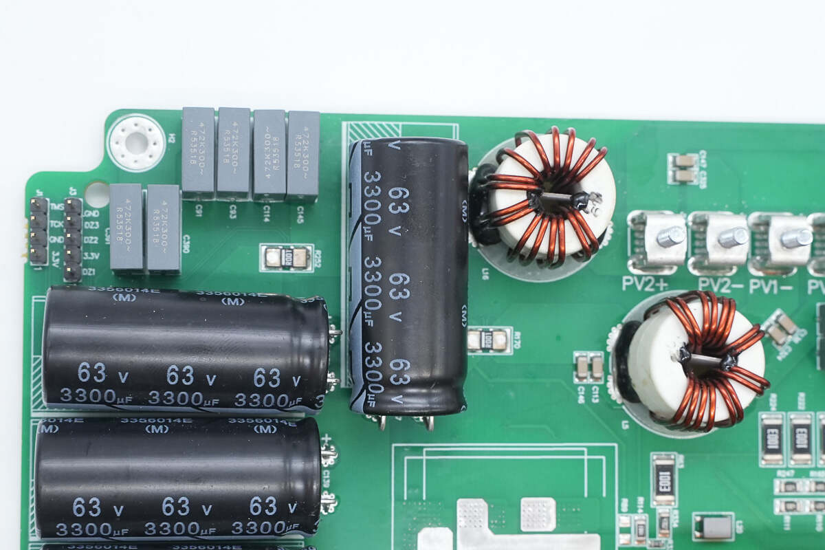 逆变器内部功率器件来自东微半导体,升压开关管型号SFS10R03UGNF,输出调制管型号OSG65R022H4T3ZF,交流输出端采用纳芯微电子NSM2013-50B5F霍尔电流采样芯片。直流输入端采用江海电解电容滤波,薄膜电容均来自厦门法拉电子。逆变器用料内部均为国内外知名品牌,配合密封设计,满足严苛的户外环境应用。