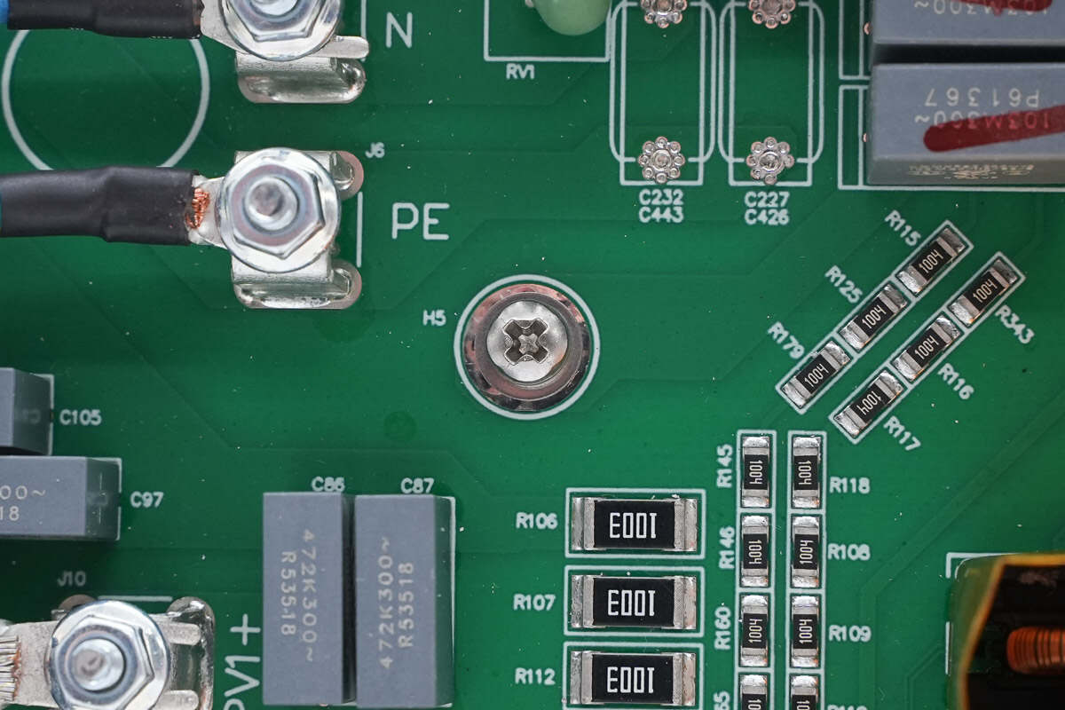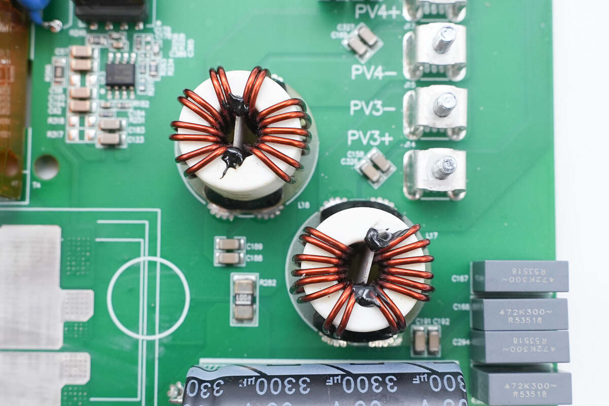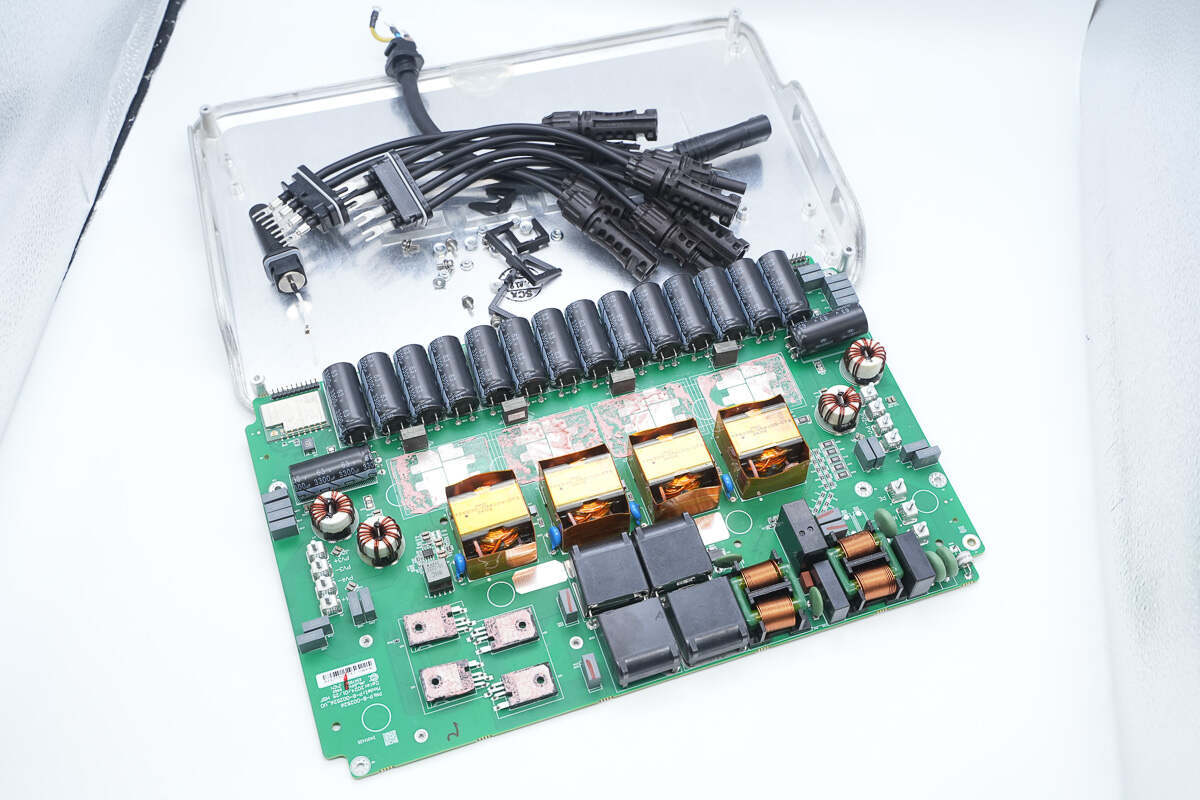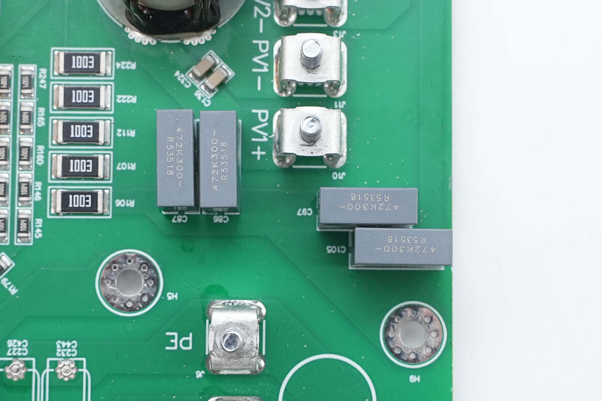 逆变器内部功率器件来自东微半导体,升压开关管型号SFS10R03UGNF,输出调制管型号OSG65R022H4T3ZF,交流输出端采用纳芯微电子NSM2013-50B5F霍尔电流采样芯片。直流输入端采用江海电解电容滤波,薄膜电容均来自厦门法拉电子。逆变器用料内部均为国内外知名品牌,配合密封设计,满足严苛的户外环境应用。