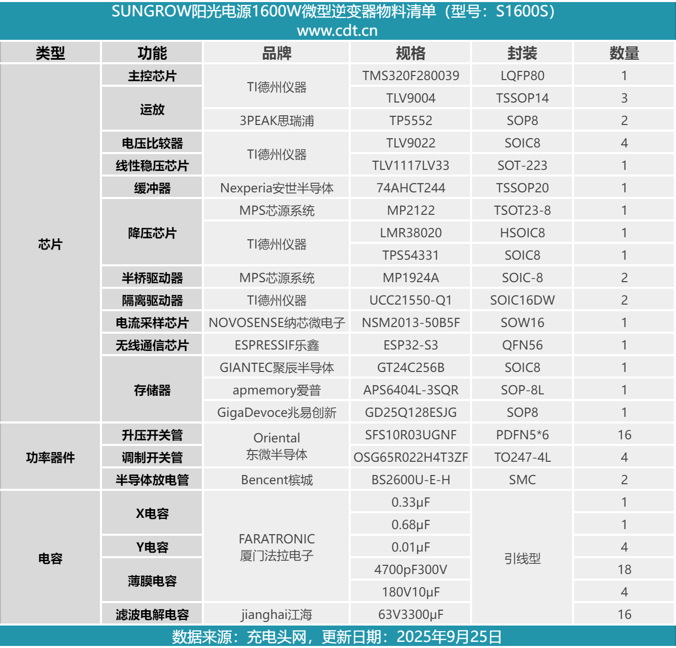最后附上阳光电源S1600S微型太阳能逆变器的核心器件清单,方便大家查阅。