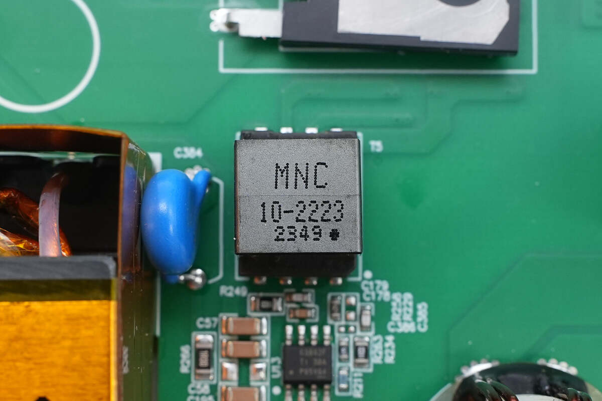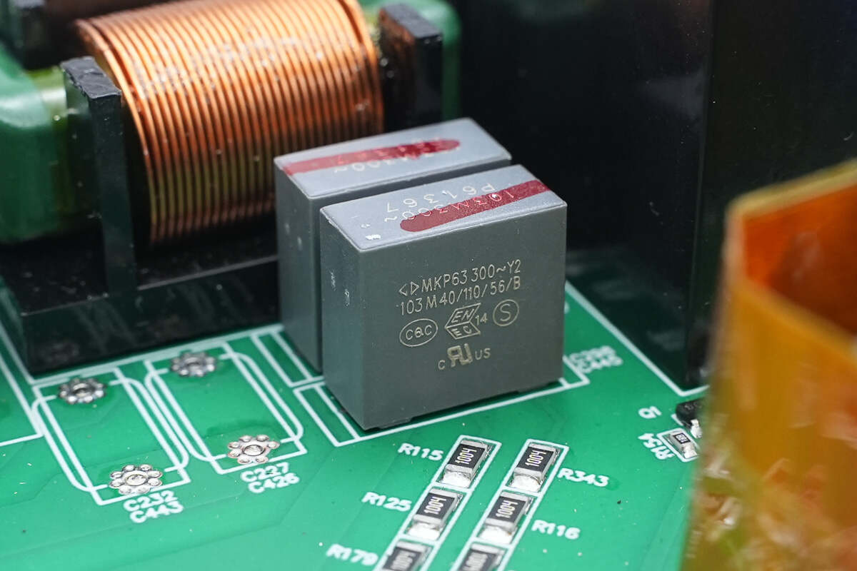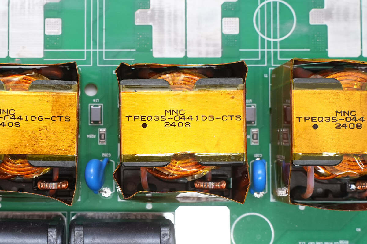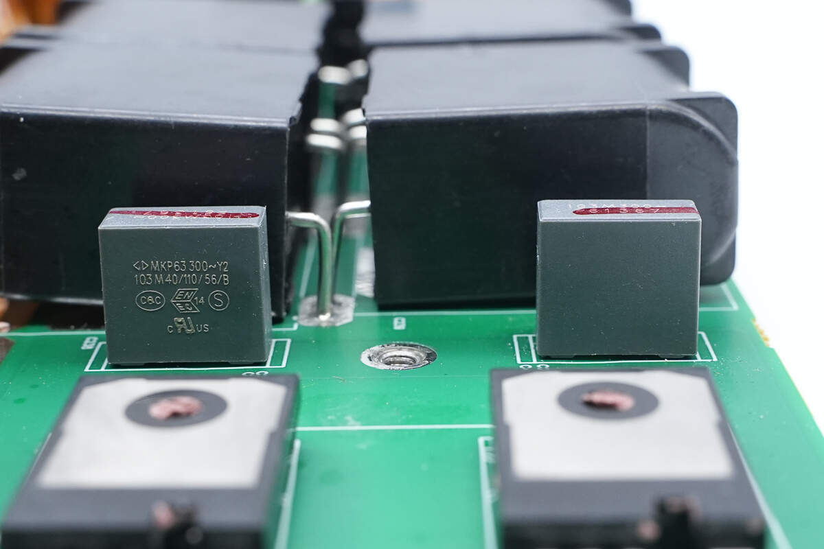 变压器上方设有四颗薄膜电容。
