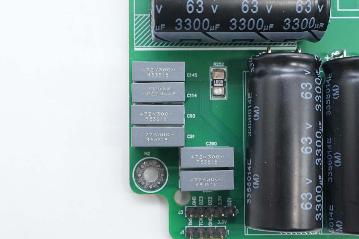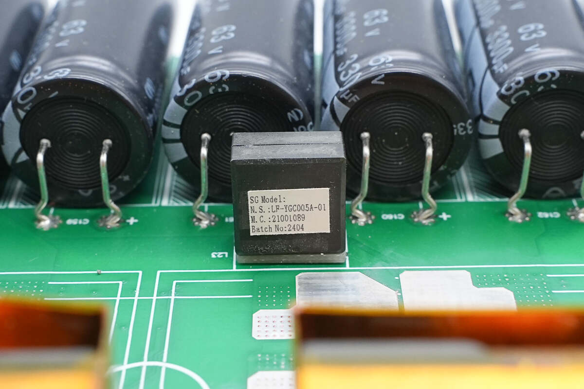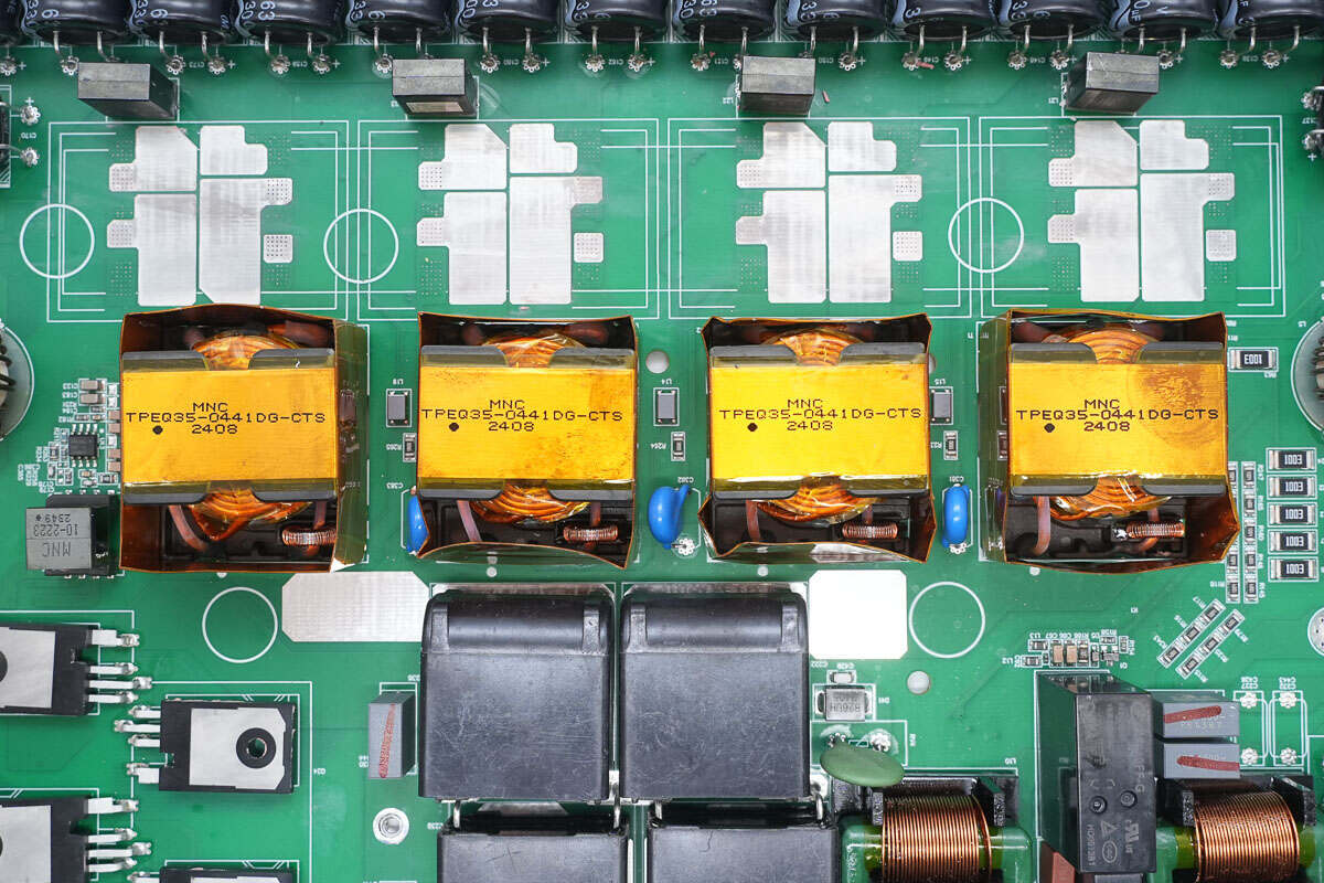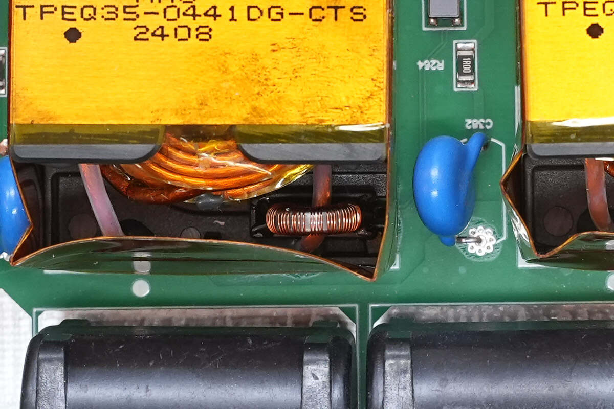 变压器上方设有四颗薄膜电容。