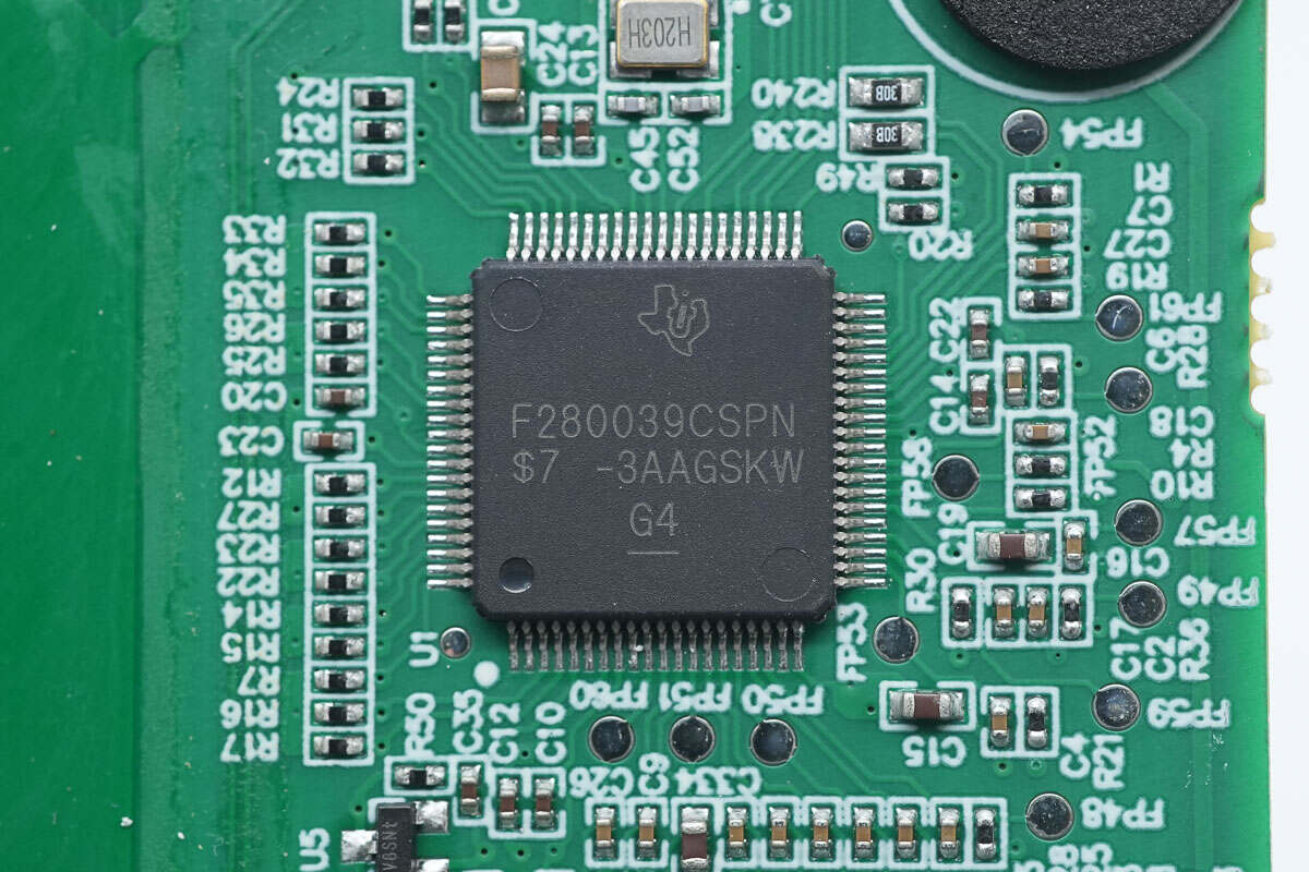 逆变器主控芯片来自德州仪器,型号TMS320F280039,芯片内置120MHz主频的32位DSP内核和120MHz主频的可编程控制律加速器,内置384KB FLASH和69KB RAM,具备16个ePWM通道,适用于电机驱动器,混合动力、电动和动力总成系统,太阳能和电动汽车充电,数字电源,车身电子装置与照明,测试和测量应用,采用TQFP80封装。