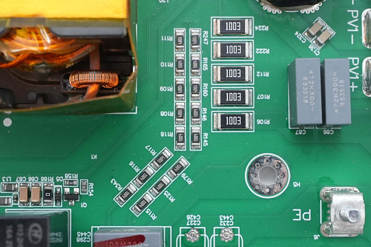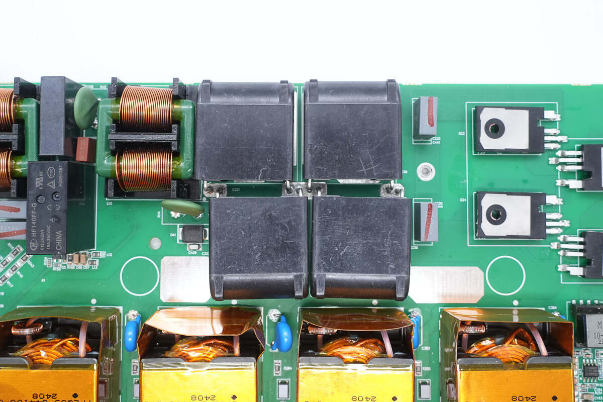 PCBA模块正面一览,左右两侧为直流输入端子,设有薄膜滤波电容和磁环滤波电感,中间位置设有升压变压器,下方设有滤波电解电容。上方中间位置设有薄膜电容,右侧设有调制管,左侧设有共模电感,压敏电阻,继电器和安规X2电容。