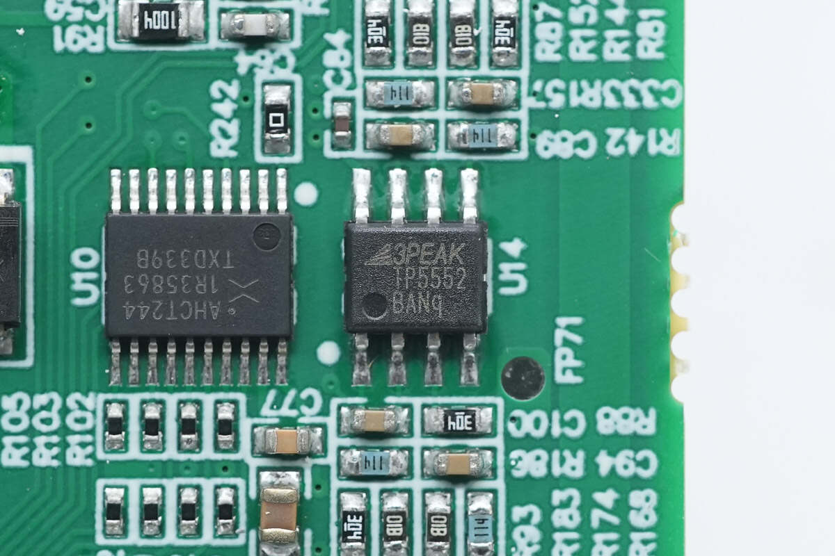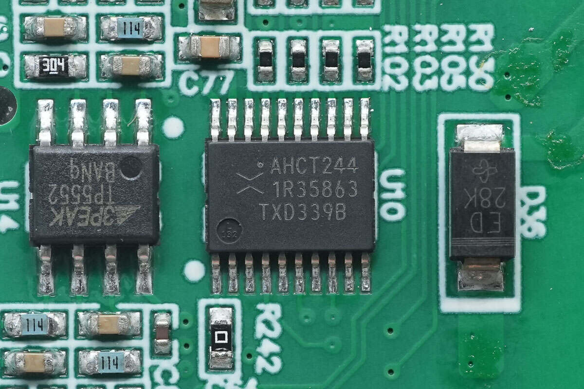 缓冲器来自安世,型号74AHCT244,是一颗八位缓冲器,可用做两个4位缓冲器,具备三态输出,支持2-5.5V电源电压范围,采用TSSOP20封装。