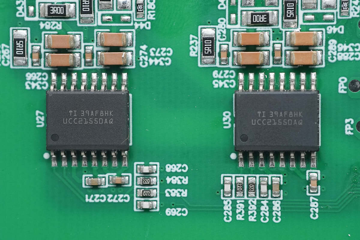 充电头网通过拆解了解到,阳光电源S1600S微型逆变器外壳设有密封圈,内部发热元件通过导热凝胶和导热垫片接触到外壳散热。逆变器内部使用德州仪器TMS320F280039主控芯片,搭配芯源系统MP1924A半桥驱动器用于升压开关管驱动,德州仪器UCC21550-Q1隔离驱动器用于调制开关管驱动。