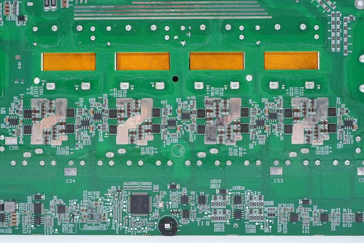 PCBA模块背面设有四路相同的升压开关管和半桥驱动器,分别对应四路输入。