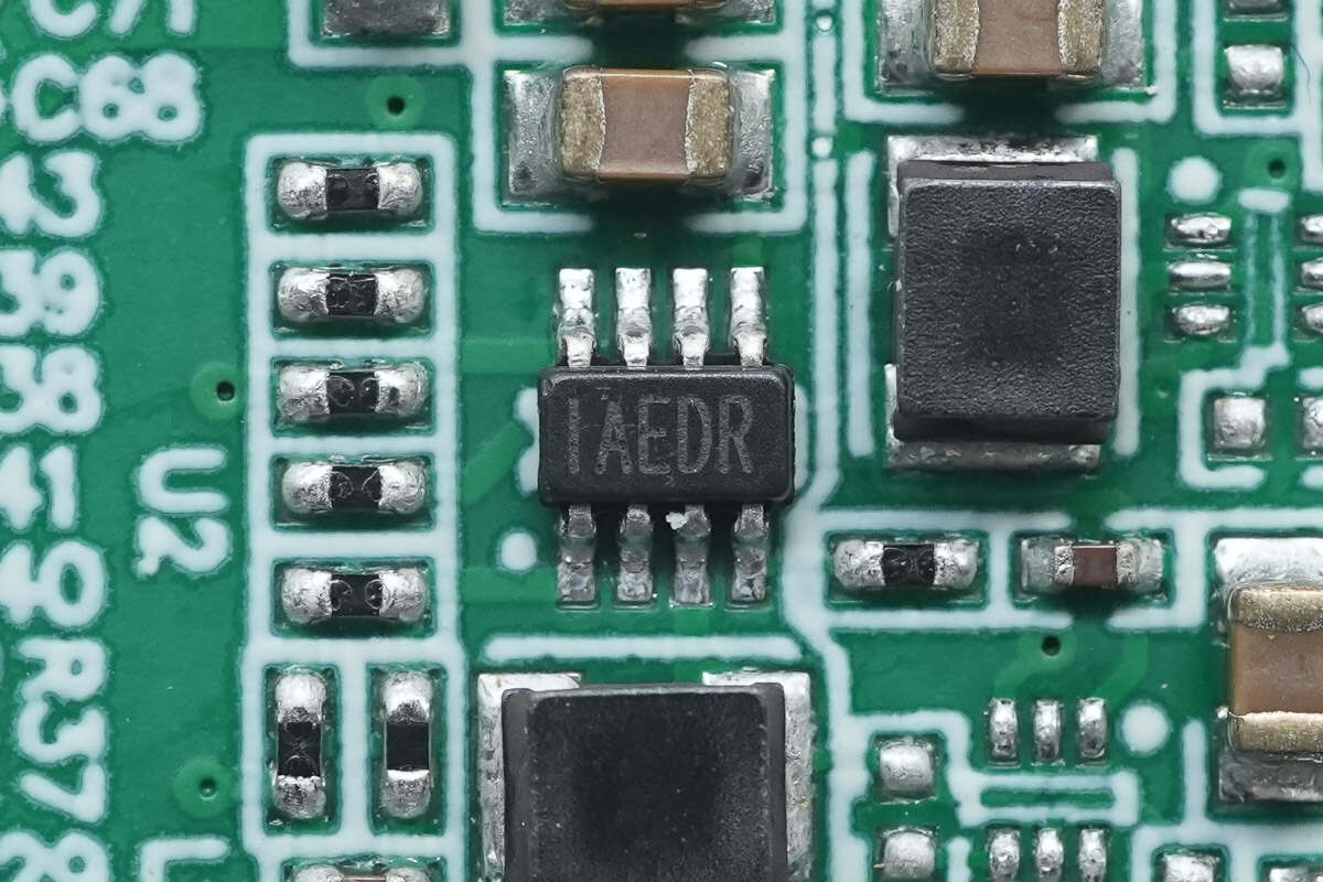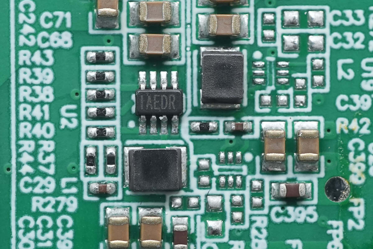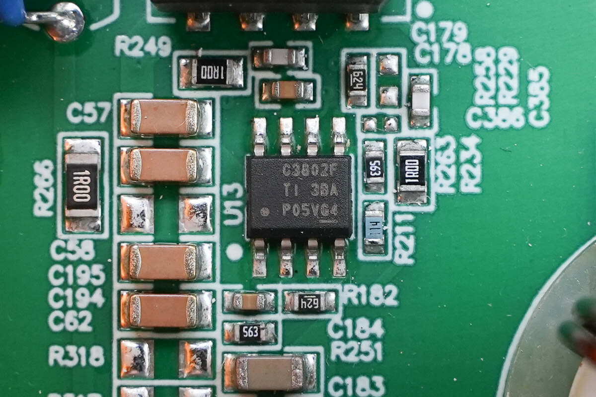 降压芯片来自德州仪器,丝印G3802F,型号LMR38020,是一颗内置开关管的同步降压转换器,芯片支持4.2-80V输入电压范围,具备2A持续输出电流,支持200kHz-2.2MHz开关频率,采用HSOIC8封装。