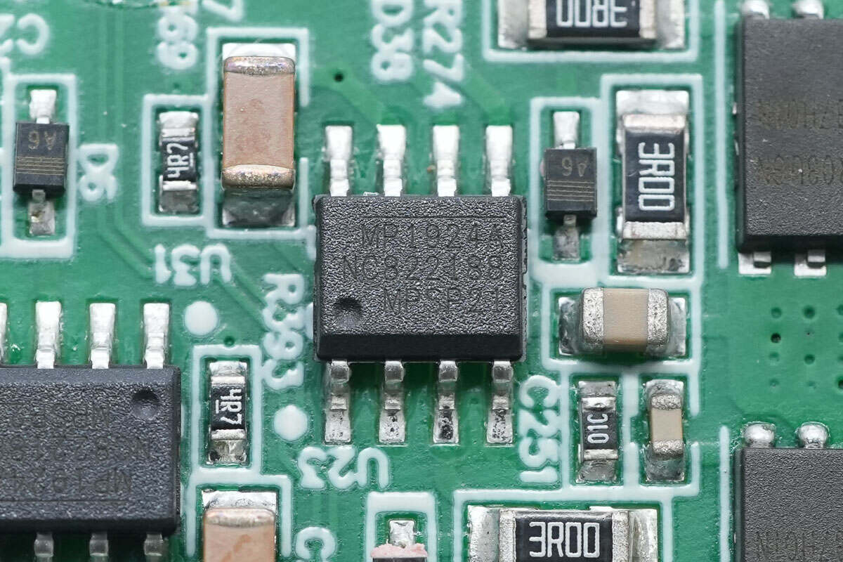 PCBA模块背面设有电流采样芯片,采用纳芯微电子NSM2013-50B5F,是一颗高精度的霍尔电流检测芯片,基于差分霍尔方案,具备高抗共模磁场干扰能力,具备0.85mΩ低导通阻抗,采用SOW16封装。