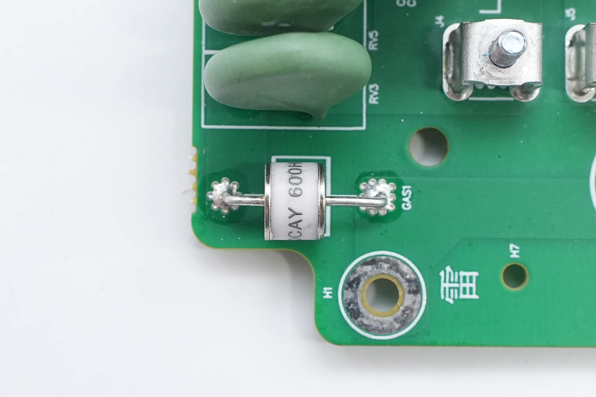 与压敏电阻搭配使用的气体放电管特写。