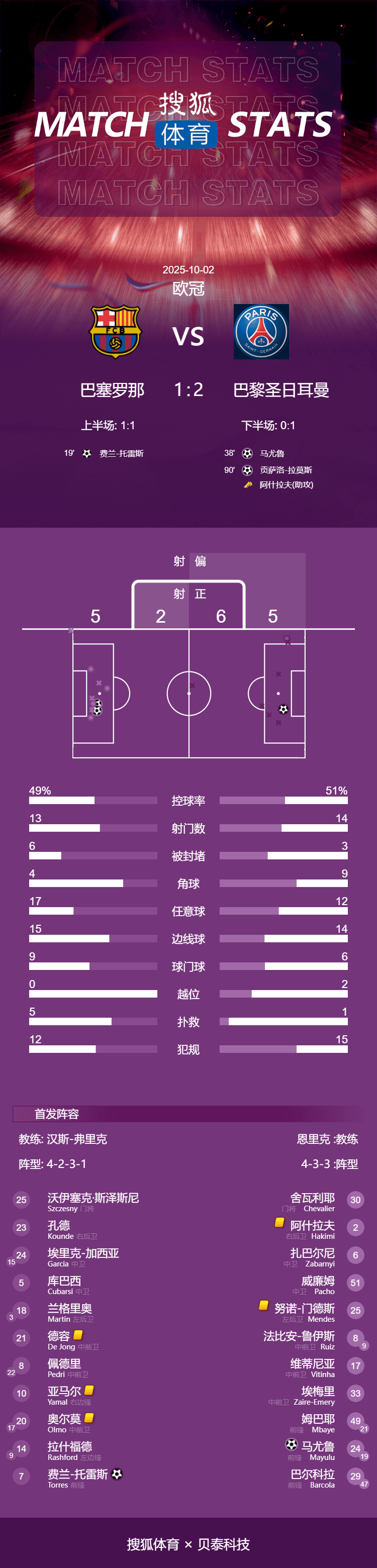 北京时间10月2日凌晨,2025-26赛季欧冠联赛阶段次轮,巴萨主场迎战卫冕冠军巴黎圣日耳曼。第19分钟,拉什福德助攻费兰破门。第36分钟,门德斯摆脱多人后助攻马尤卢扳平。第90分钟,贡萨洛-拉莫斯抢点绝杀!最终巴黎客场2-1逆转巴萨!