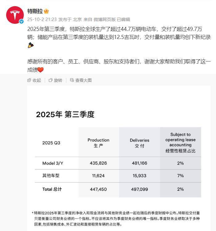 据特斯拉官方微博10月2日晚间消息,2025年第三季度,特斯拉全球生产了超过44.7万辆电动车,交付了超过49.7万辆。储能产品在第三季度的装机量达到12.5吉瓦时,交付量和装机量均创下新纪录。