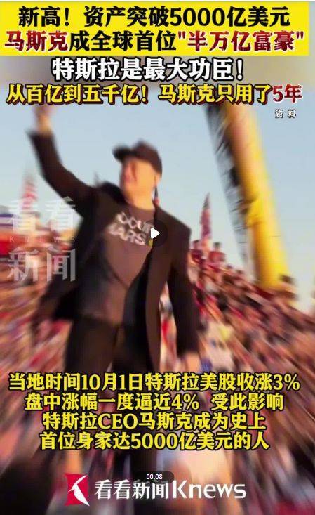 值得注意的是,当地时间10月1日,特斯拉首席执行官埃隆·马斯克再创财富纪录,其个人身价突破5000亿美元大关,成为有史以来全球首位“半万亿富翁”。