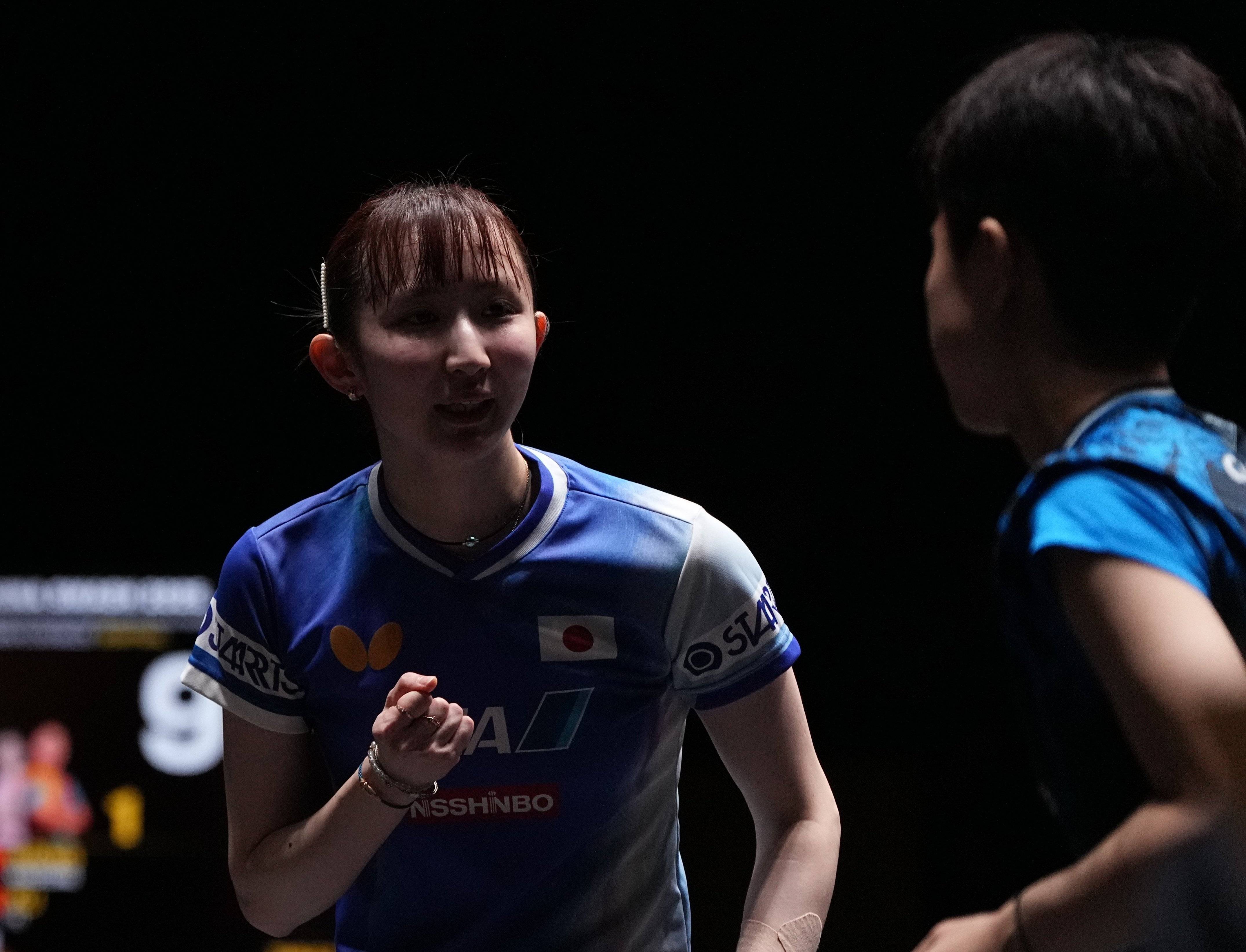 10月3日,早田希娜/朱芊曦(右)在比赛中。 新华社记者 鞠焕宗 摄