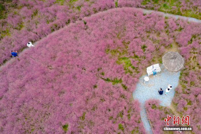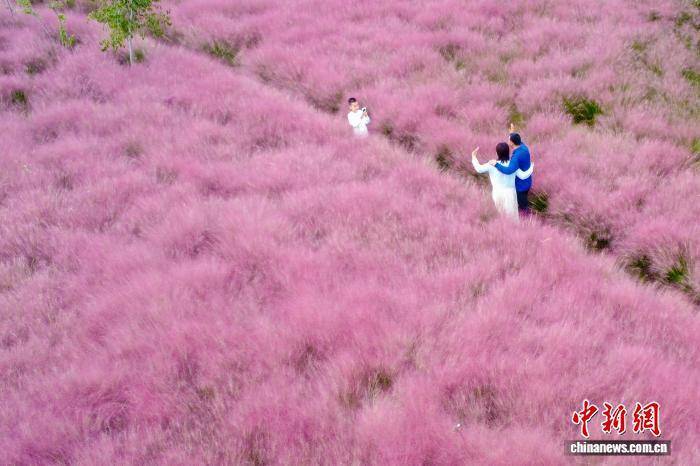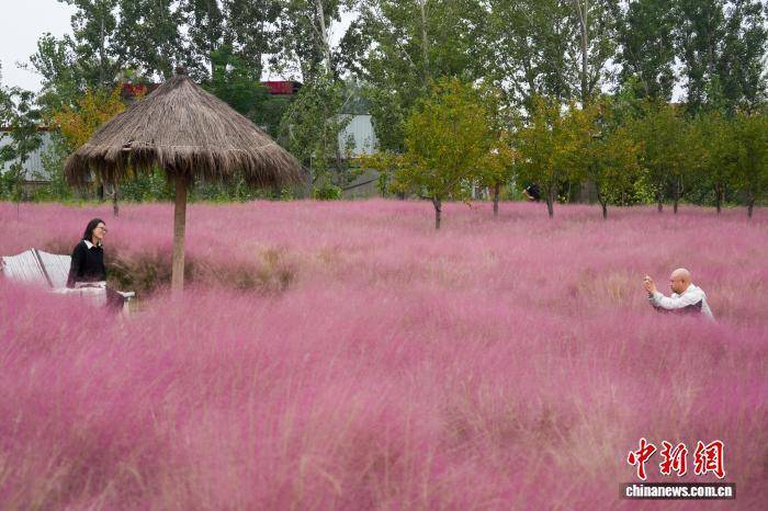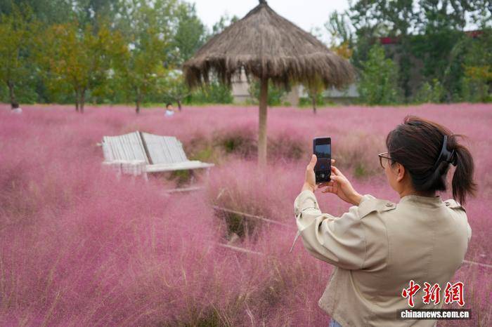 10月3日,河南郑州黄河大堤万滩段,盛开的粉黛乱子草吸引了众多游人前来观赏,人们走在粉色花海中感受秋天的景色。中新社记者 范晓恒 摄