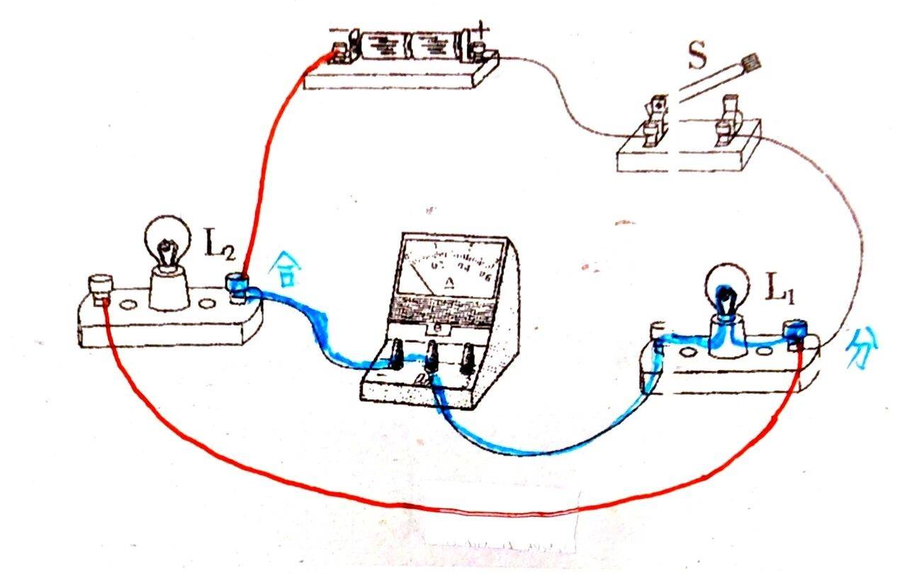 另外还有一种题,是判断电流表测量对象的问题,此类题在实物图中尤其容易出错,特别是由于电流表的两个接线柱挨得太近,再加上有些初中生不仔细分析电流路径,从而出错,大家试一试下面这道题,考考自己吧。