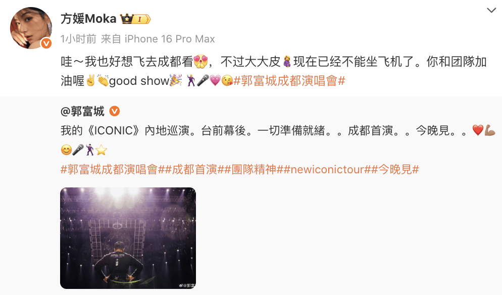 搜狐娱乐讯 4日,“天王嫂”方媛转发老公郭富城的演唱会动态,并配文称:“哇~我也好想飞去成都看,不过大大皮,现在已经不能坐飞机了。你和团队加油喔!good show!”