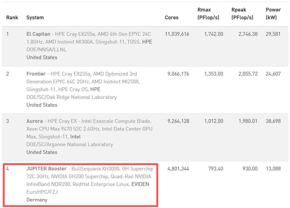JUPITER 是欧洲第一台百亿亿次级别的超算系统,100% 由可再生能源驱动,在 2025 年 6 月的 TOP500 榜单上排名全球第四、欧洲第一。