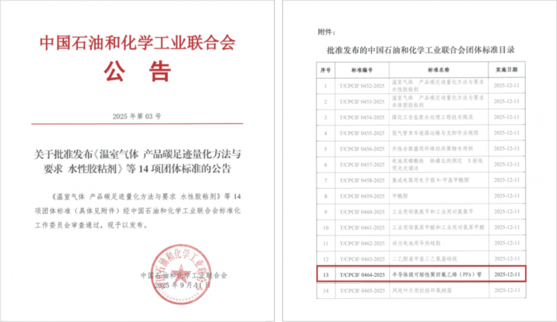 近日,中国石油和化学工业联合会正式发布14项团体标准的公告。其中,由保视丽牵头起草,20余家超纯氟材料高新企业共同参与的《半导体级可熔性聚四氟乙烯(PFA)管》(T/CPCIF 0464-2025)团体标准经中国石油和化学工业联合会标准化工作委员会审查通过并发布,将于2025年12月11日正式实施。