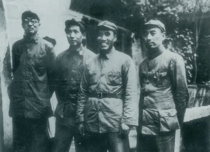 毛泽东和朱德、周恩来、林伯渠的合影。