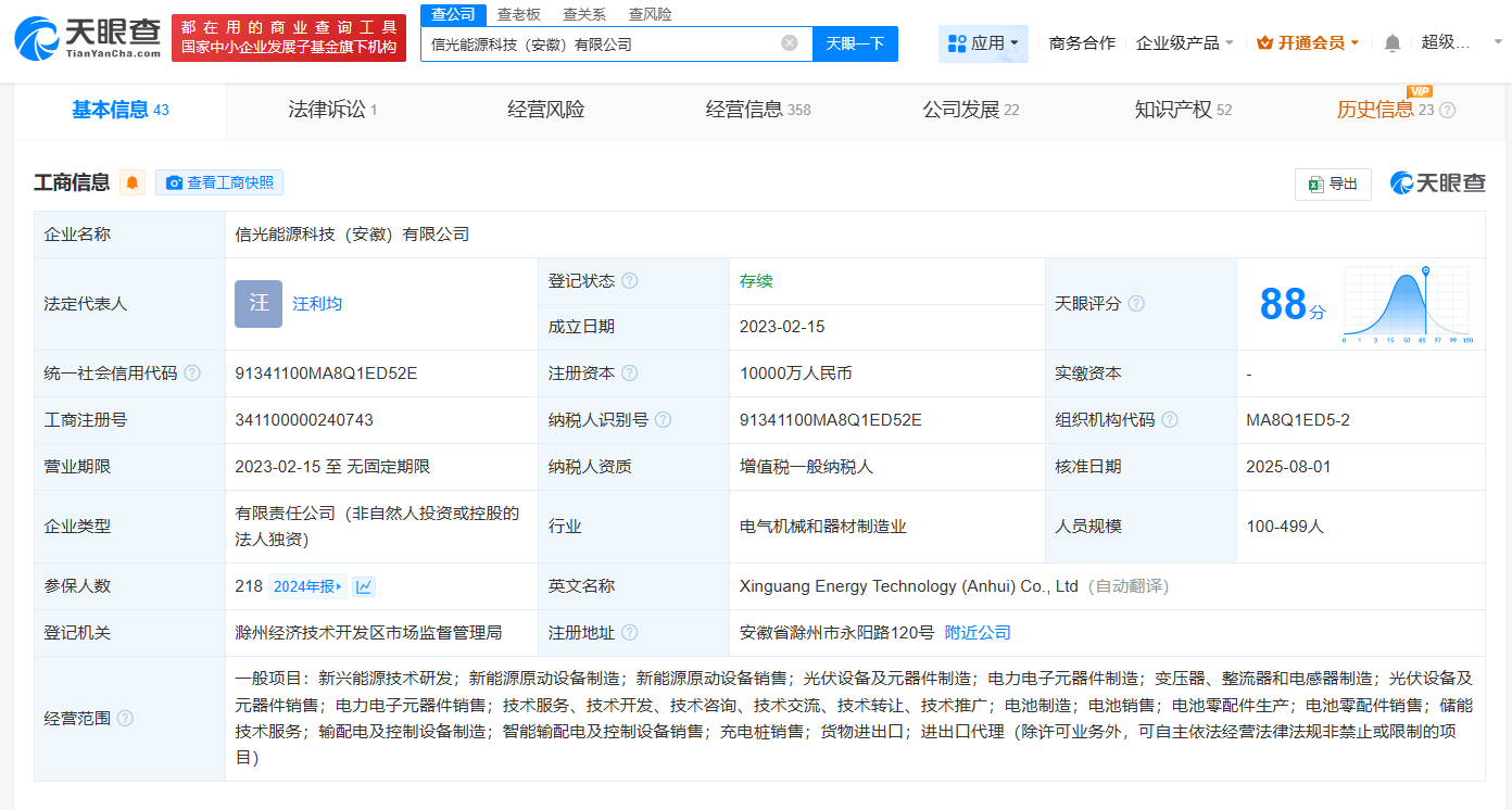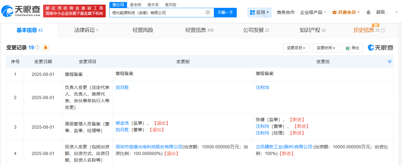 天眼查工商信息显示,近日,信光能源科技(安徽)有限公司发生工商变更,信濠光电(301051)退出股东行列,新增立讯精密(002475)旗下立讯精密工业(滁州)有限公司全资持股,同时该公司法定代表人等发生变更。