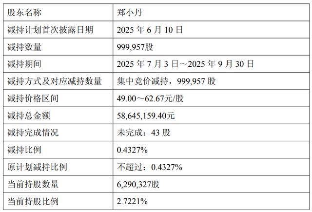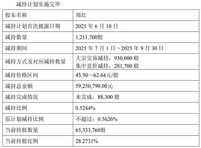 公告显示,本次减持计划实施前,郑红持有公司股份66,545,460股,占公司总股本的28.7975%;郑小丹女士持有公司股份7,290,284股,占公司总股本的3.1549%。