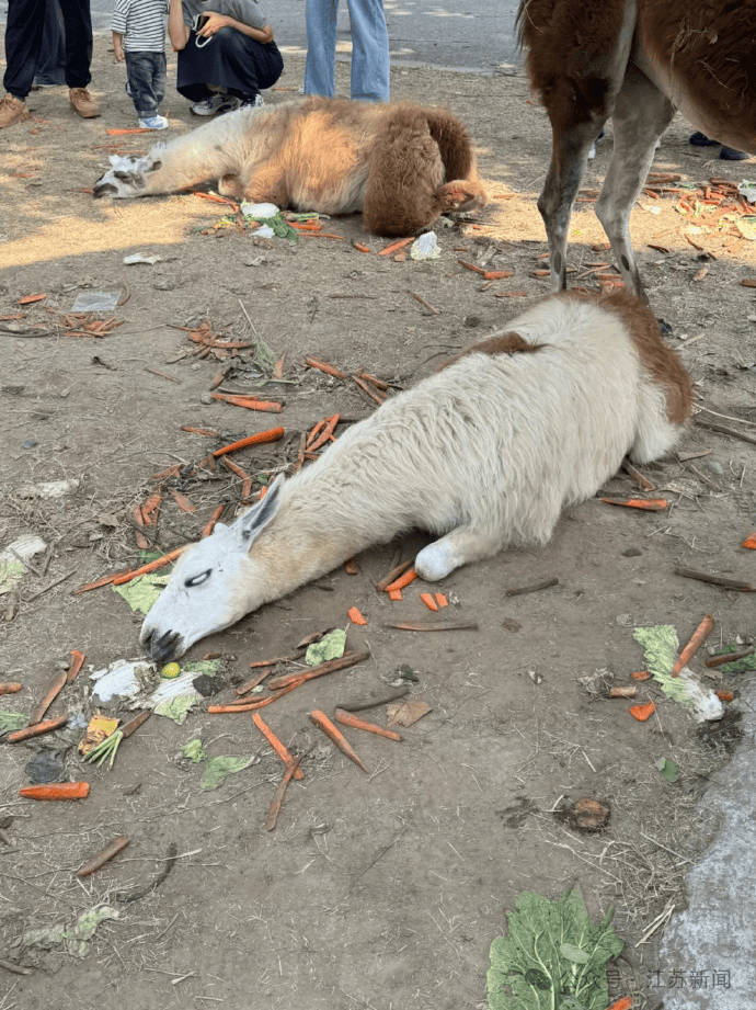 网帖图片显示,2只羊驼躺倒在地,眼神呆滞,四周散落着大量胡萝卜、白菜等食物残渣。有网友留言调侃:“它们真的吃不下了。”