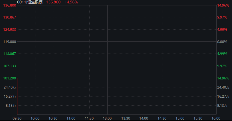 恒生银行跳空大涨15%,汇丰拟将恒生银行私有化,交易价值约2907亿港元。