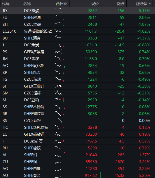 商品:国内商品期货多数下跌,截至发稿,鸡蛋跌超5%,燃油跌超2%,烧碱、集运指数、沥青跌超1%,焦炭、多晶硅、焦煤、氧化铝、纸浆、玻璃、工业硅、锰硅、豆粕等纷纷下跌,沪金、沪银逆势大涨,其中沪金涨超5%。