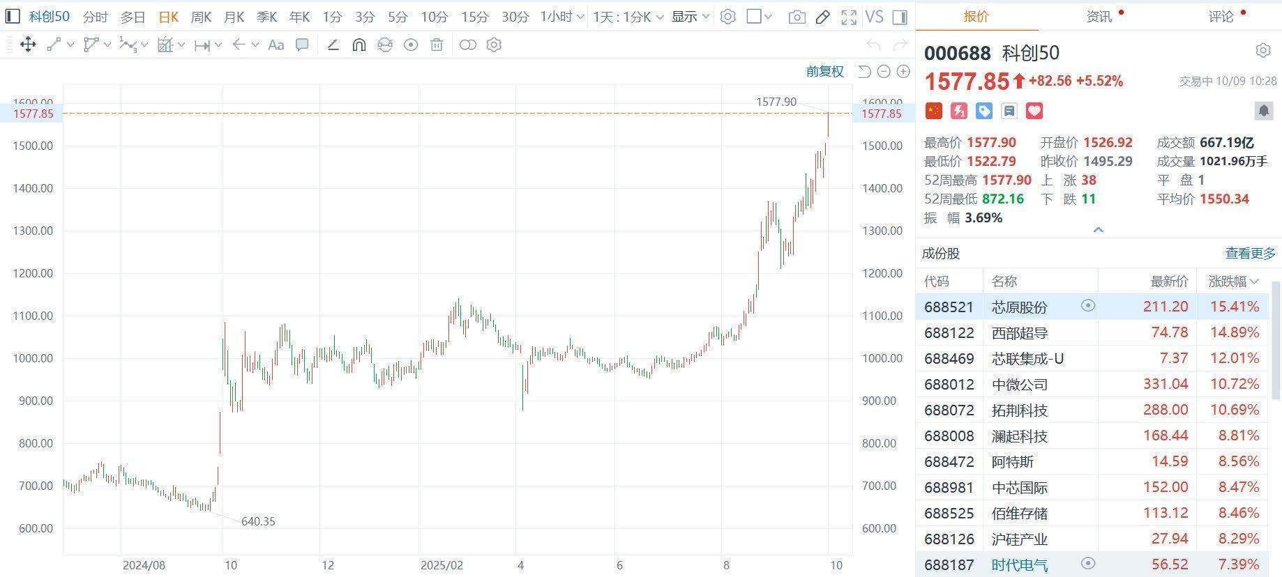 格隆汇10月9日|科创50指数涨幅扩大至超5%。中芯国际、华虹公司、江波龙、灿芯股份、芯联集成等多只芯片股创历史新高。、芯原股份均涨超15%,涨超10%。