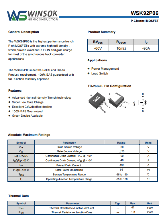 二、WSK92P06关键特性