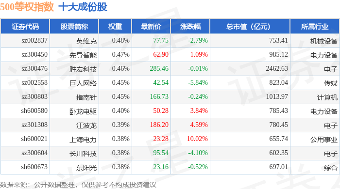 证券之星消息,10月9日,500等权(399982)指数报收于9114.51点,涨1.82%,成交5357.57亿元,换手率2.5%。当日该指数成份股中,上涨的有359家,西部超导以20.0%的涨幅领涨,下跌的有137家,光线传媒以10.53%的跌幅领跌。
