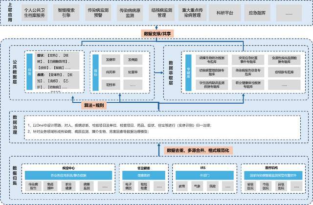 一是构建公共卫生领域多源异构数据归集体系。依托公共卫生大数据平台,与外部系统建立长期、有效的良性合作机制,汇聚离散的个人健康数据,打破信息孤岛困局。主要包括全省公立医疗机构与基层医疗卫生机构的电子病历、处方、检验检查等诊疗记录;涵盖传染病、慢性病、免疫规划、职业健康、学生健康、食品安全等领域的公共卫生监测数据;以及教育、气象、地理信息、舆情等跨部门协同数据。