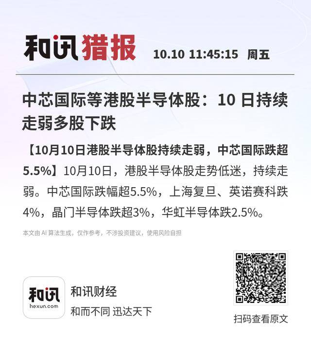 【10月10日港股半导体股持续走弱,中芯国际跌超5.5%】10月10日,港股半导体股走势低迷,持续走弱。中芯国际跌幅超5.5%,上海复旦、英诺赛科跌4%,晶门半导体跌超3%,华虹半导体跌2.5%。