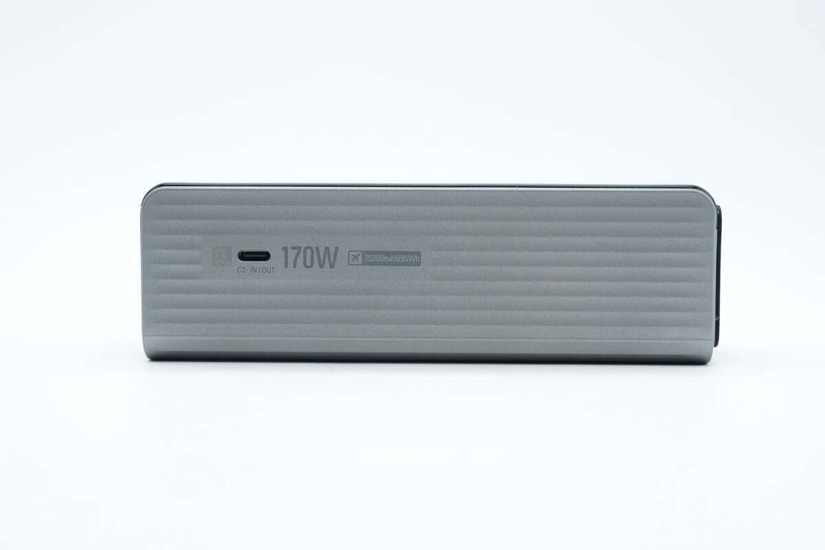 另一侧配置USB-C2双向快充接口,接口右侧壳体上印有170W、25000mAh/90Wh以及可携带上飞机标识。