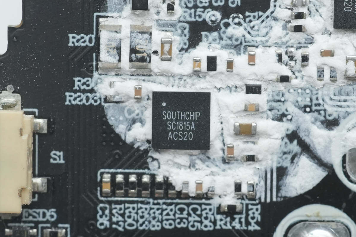 此外采用南芯科技SC1815A升降压控制器搭配芯海科技CPW3221协议芯片方案实现2C1A接口快充控制。芯海科技MCU搭配复旦微存储器为丰富屏显功能提供支持,德州仪器降压方案进行供电。壳体上贴有石墨散热贴纸,器件、电芯打胶加固,做工可靠。