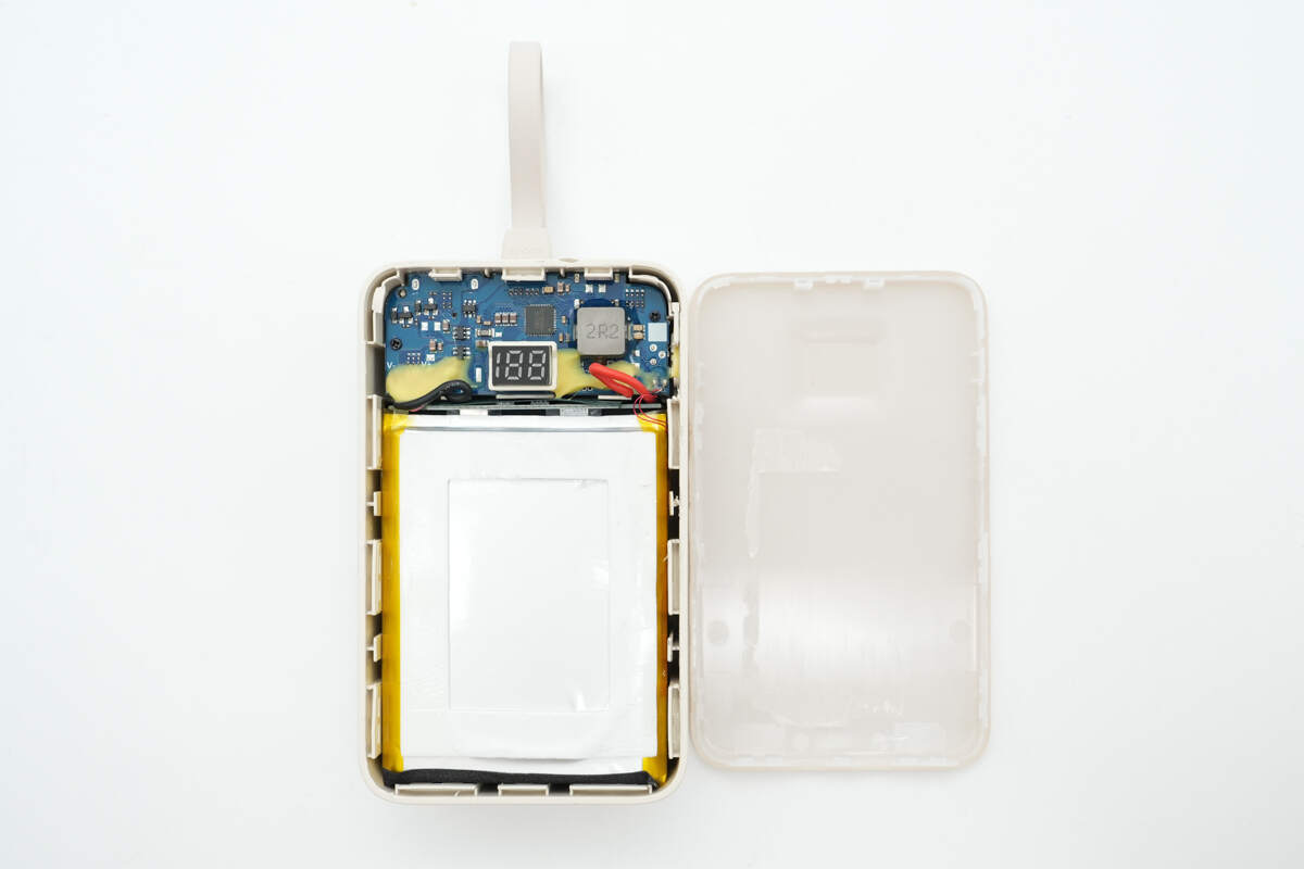 充电头网通过拆解了解到,移动电源内置电池组由亿纬锂能两块电芯组成,电芯通过了CCC认证,并采用纮康HY2116锂电保护方案实现过流、过充、过功率等保护,此外配有热敏电阻进行温度监控,低温充电不易发烫,提升使用体验。