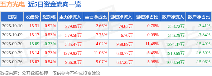 证券之星消息,截至2025年10月10日收盘,五方光电(002962)报收于15.31元,上涨0.92%,换手率3.29%,成交量6.88万手,成交额1.05亿元。