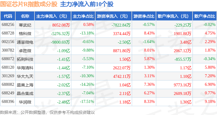 资金流向方面,国证芯片R(480017)指数成份股当日主力资金净流出合计129.31亿元,游资资金净流入合计67.08亿元,散户资金净流入合计62.24亿元。成份股资金流向详情见下表: