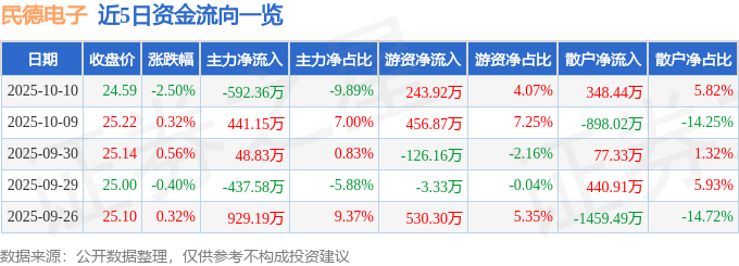 证券之星消息,截至2025年10月10日收盘,民德电子(300656)报收于24.59元,下跌2.5%,换手率1.82%,成交量2.42万手,成交额5991.72万元。