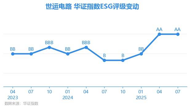 日前,华证指数公布了新一期(2025年7月31日)的ESG评级结果,世运电路(603920.SH)获得AA评级(华证指数评级为C起至AAA九档,C为最低档,AAA为其最高一级评级/AA为其第二档),上一期(2025年4月30日)ESG评级为AA。本期ESG评级在529家电子设备、仪器和元件行业A股上市公司中排名第17(上一期排名第18)。