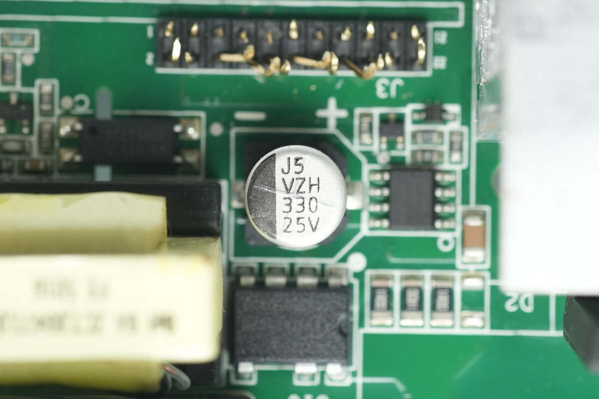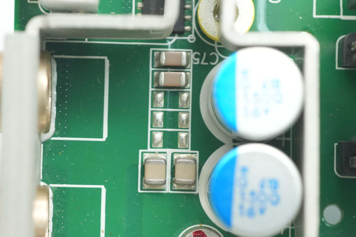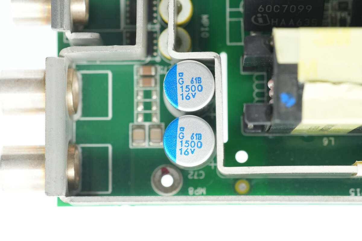 输出端两颗滤波电容来自贵弥功,为系列导电性高分子固体铝电解电容器,规格为1500μF16V。