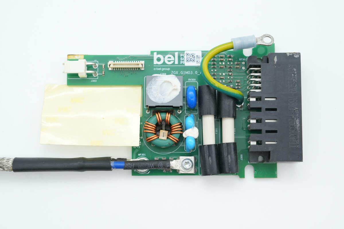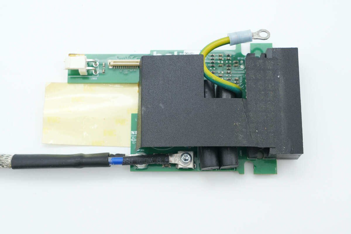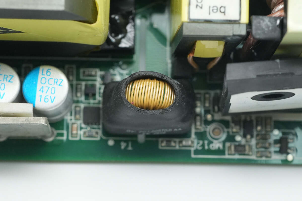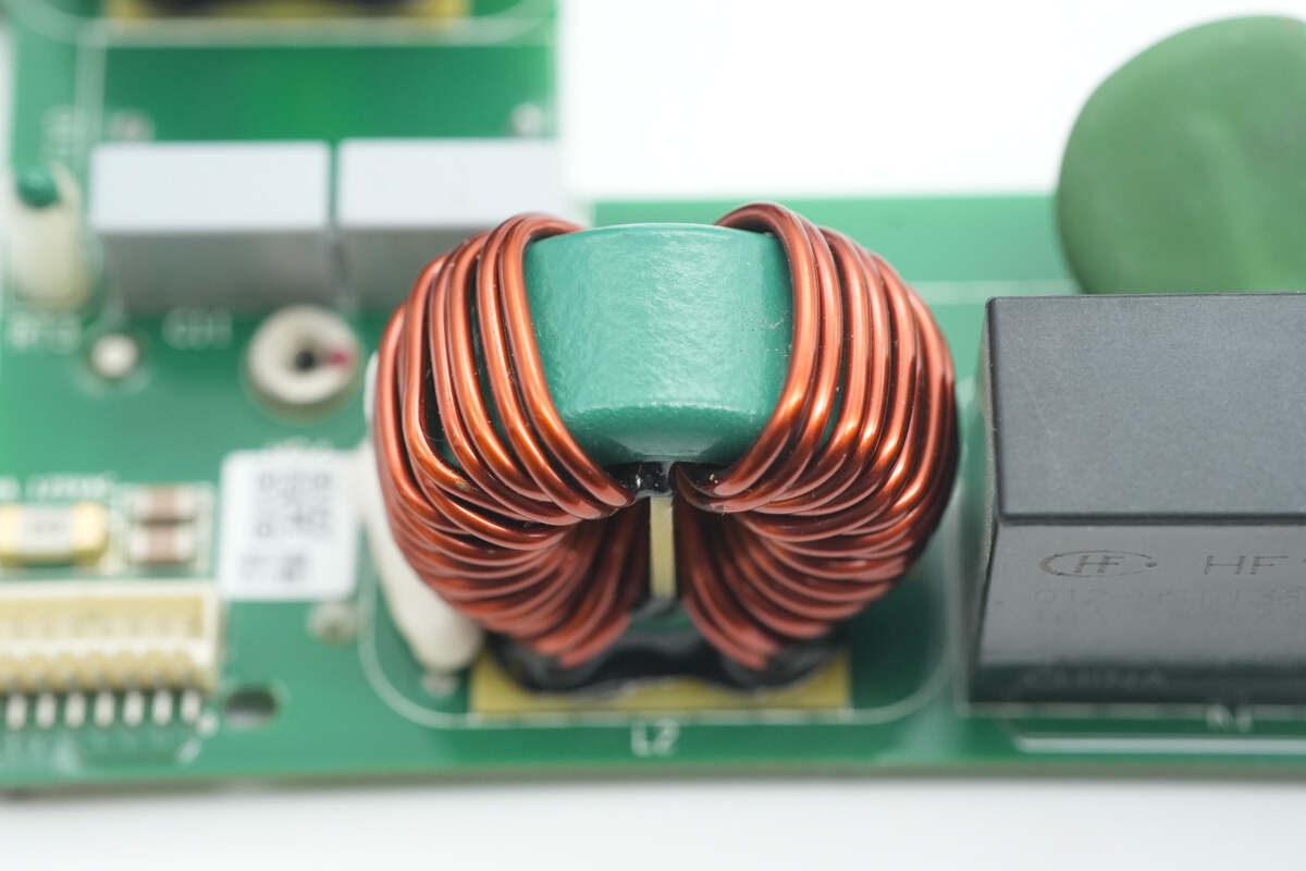 共模电感左侧设有贴片保险丝和散热风扇连接器。