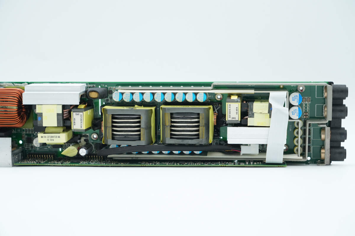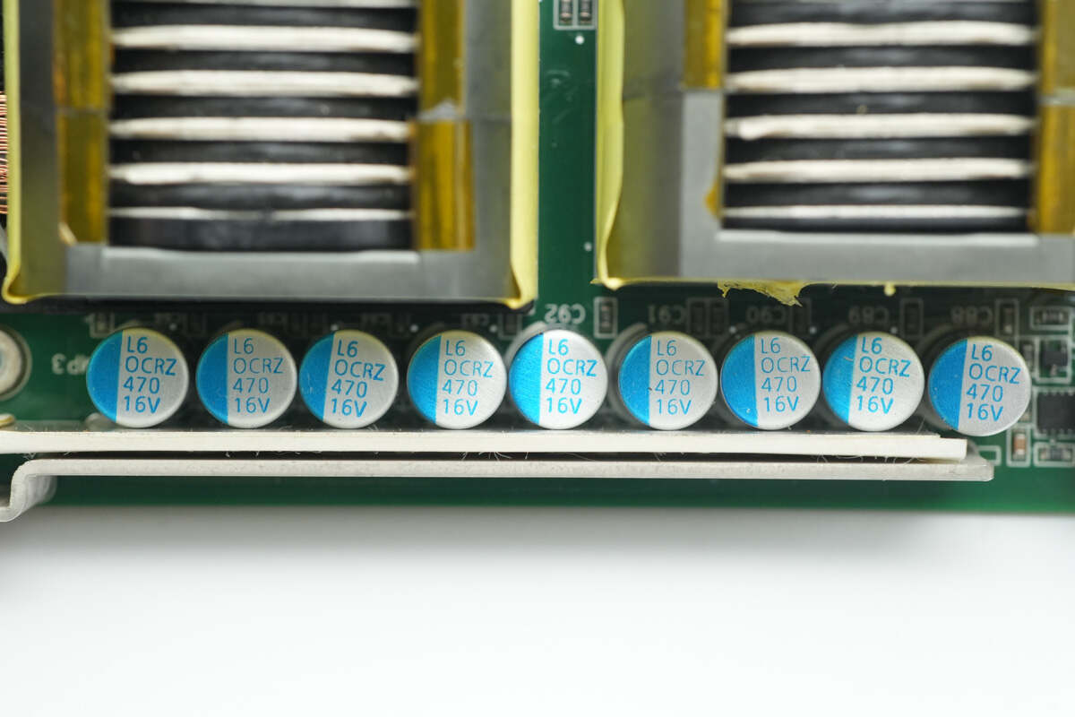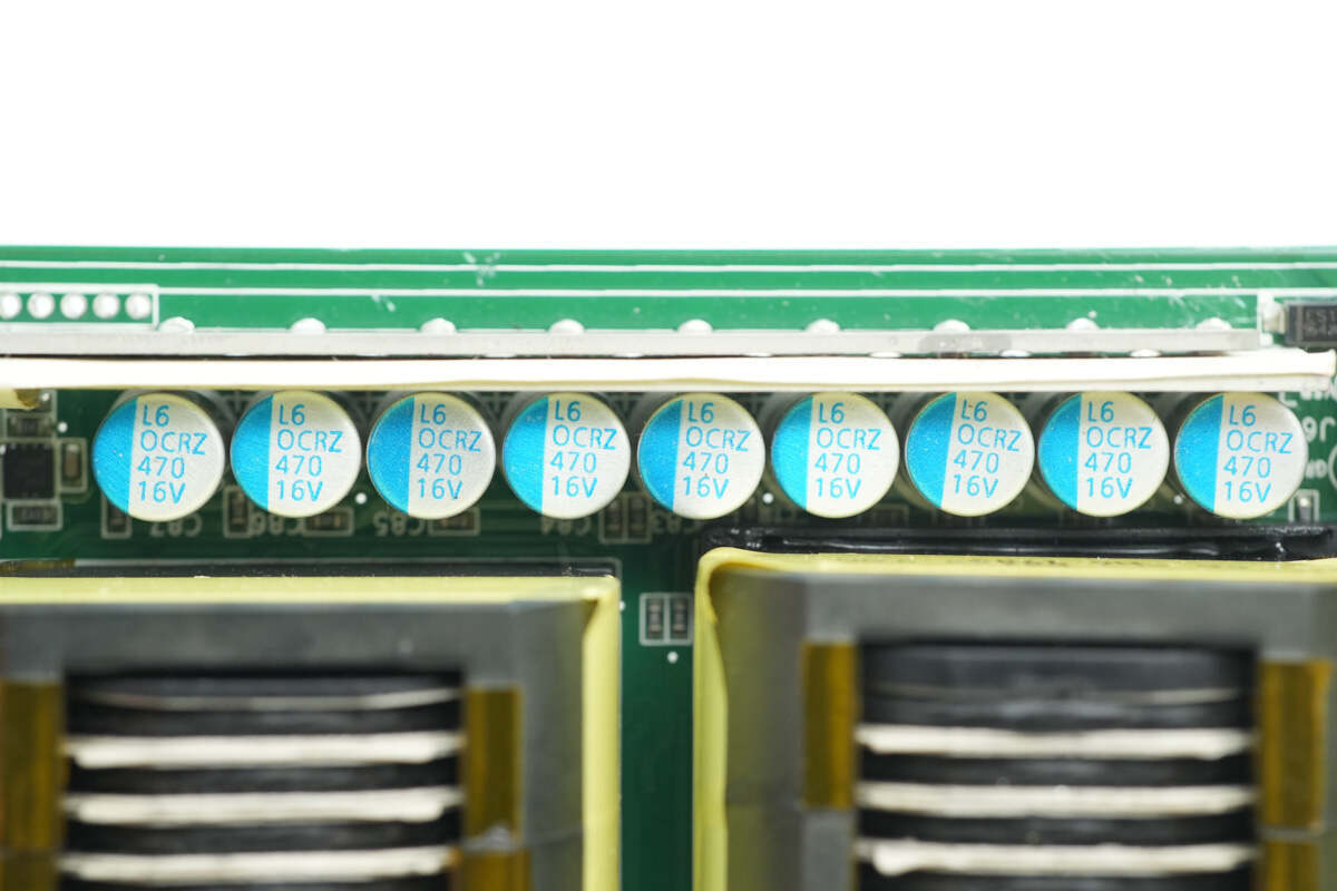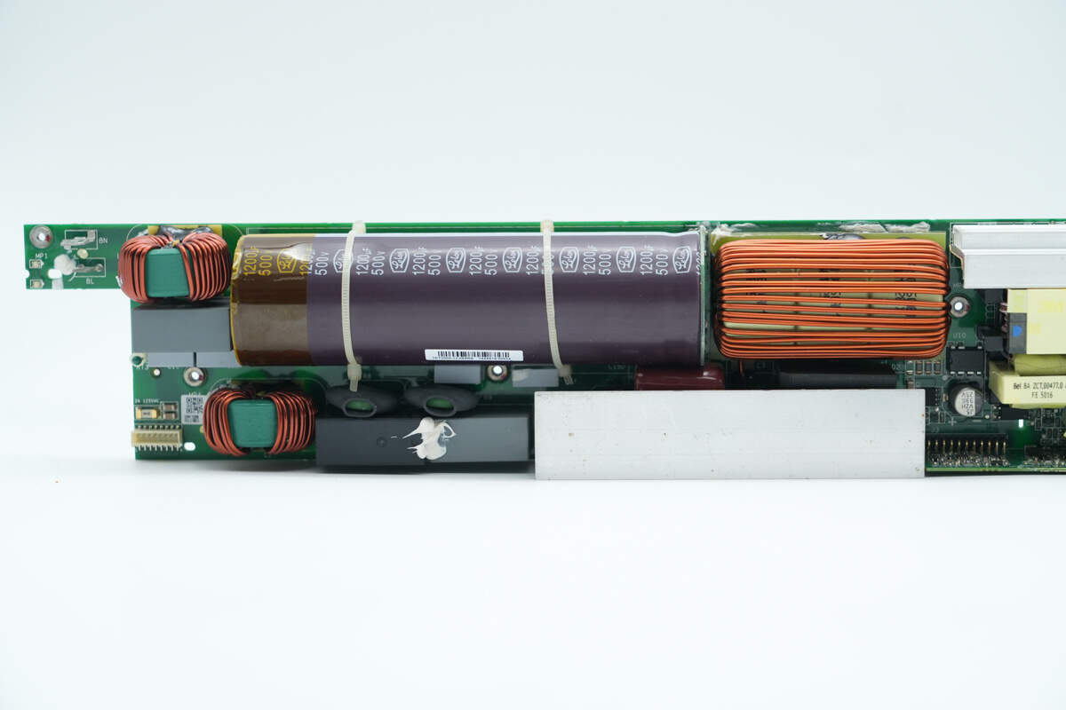 电源内部设有输入小板,交流输入通过导线连接,PCBA模块侧面焊接控制小板,设有PFC控制器和LLC控制器。高压滤波电容和固态滤波电容均为立隆品牌,还使用贵弥功电容滤波。正负极输出均采用铜排连接,降低电阻。电源用料均为知名品牌,内部做工扎实可靠。