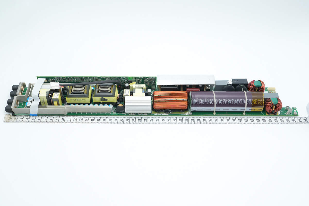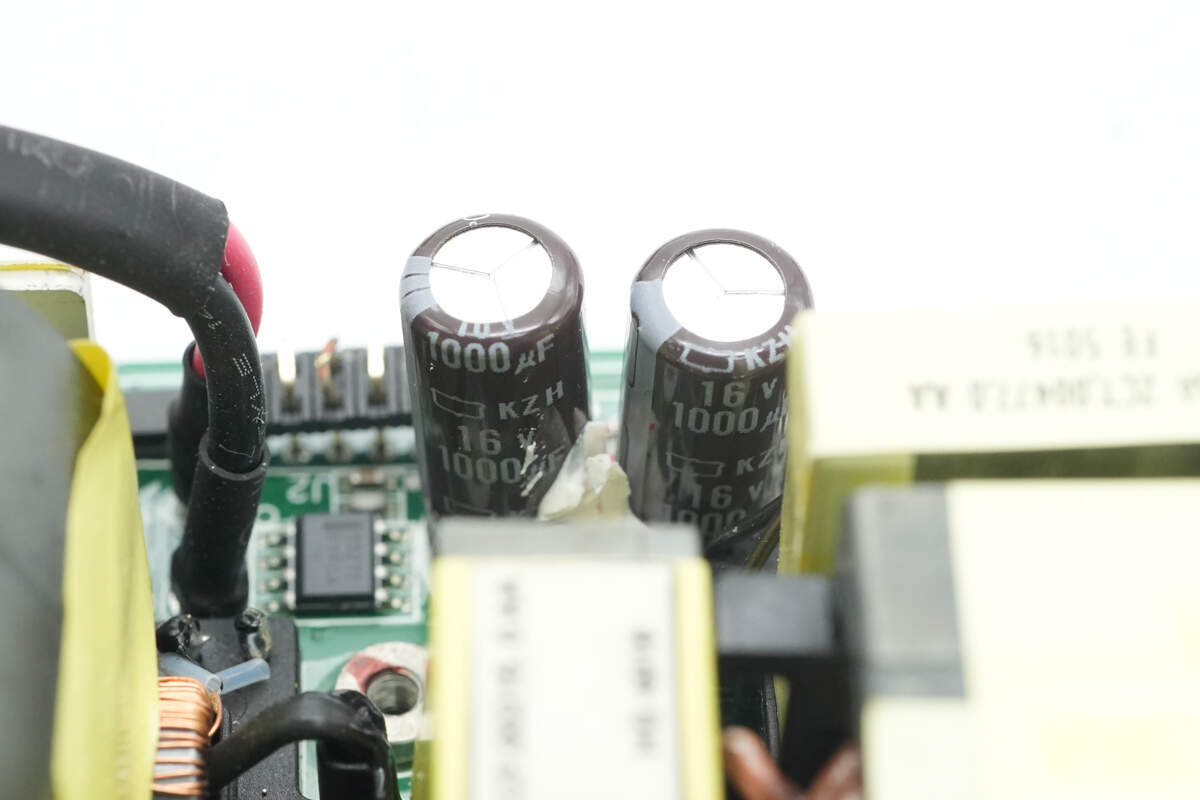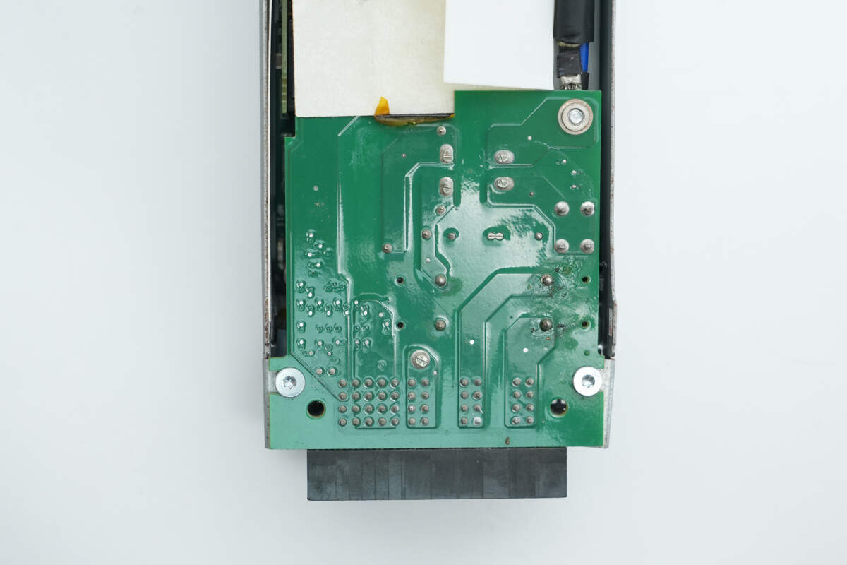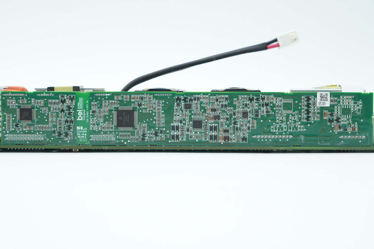 电源内部设有输入小板,交流输入通过导线连接,PCBA模块侧面焊接控制小板,设有PFC控制器和LLC控制器。高压滤波电容和固态滤波电容均为立隆品牌,还使用贵弥功电容滤波。正负极输出均采用铜排连接,降低电阻。电源用料均为知名品牌,内部做工扎实可靠。