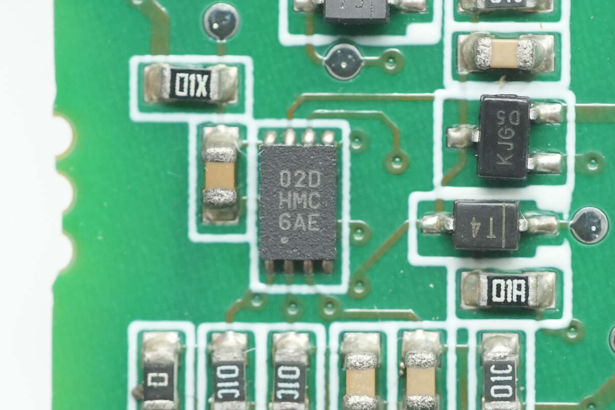 一颗丝印02DHMC的芯片特写。