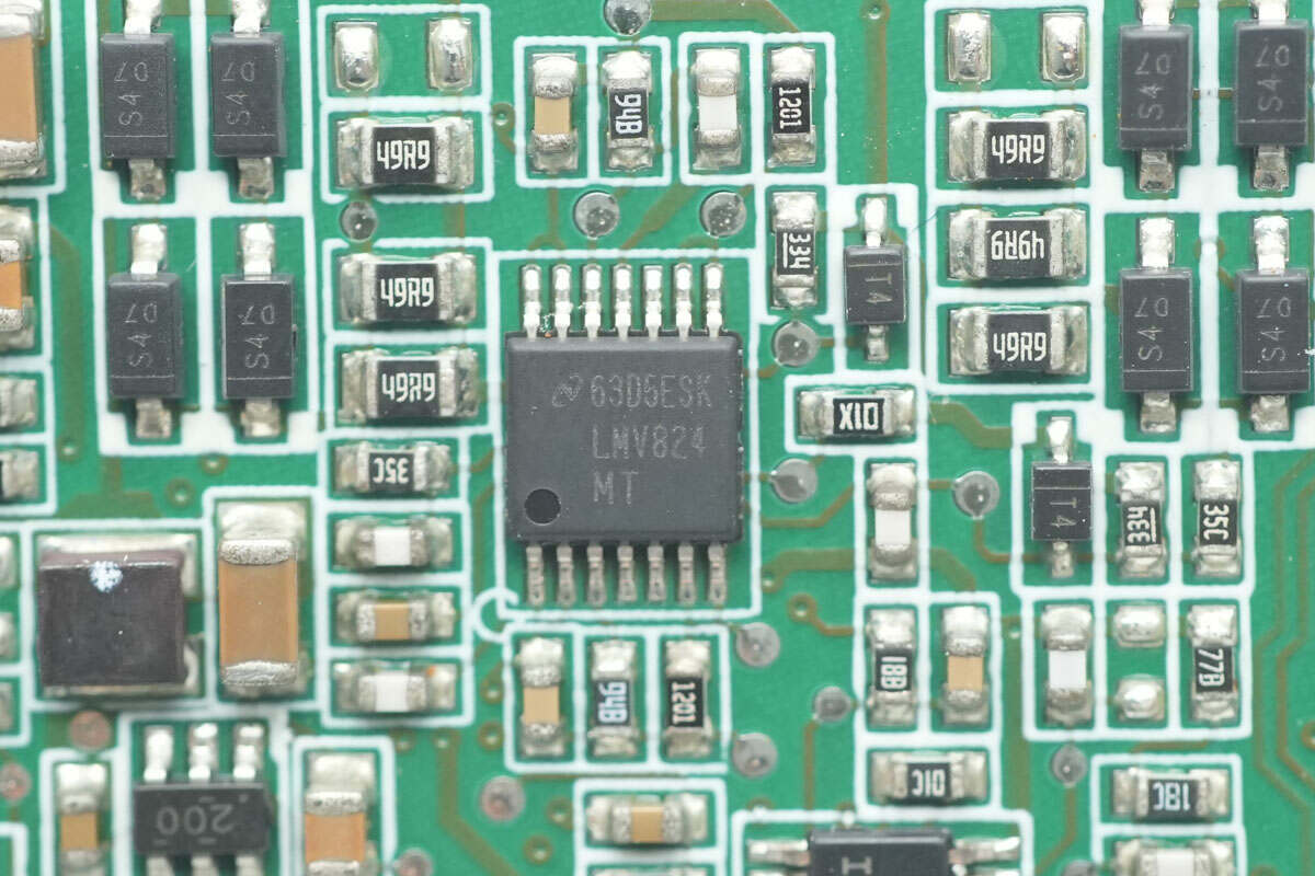 运放芯片来自德州仪器,型号LMV824,是一颗轨对轨输出的四运放,采用TSSOP14封装。